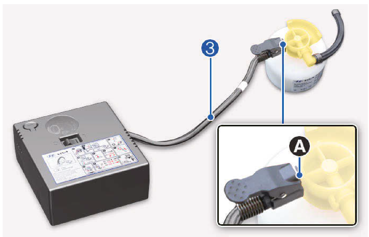 將充填軟管(3)連接並固定到密封劑罐接頭[A]。將密封劑罐直立,使充填軟管朝上。
