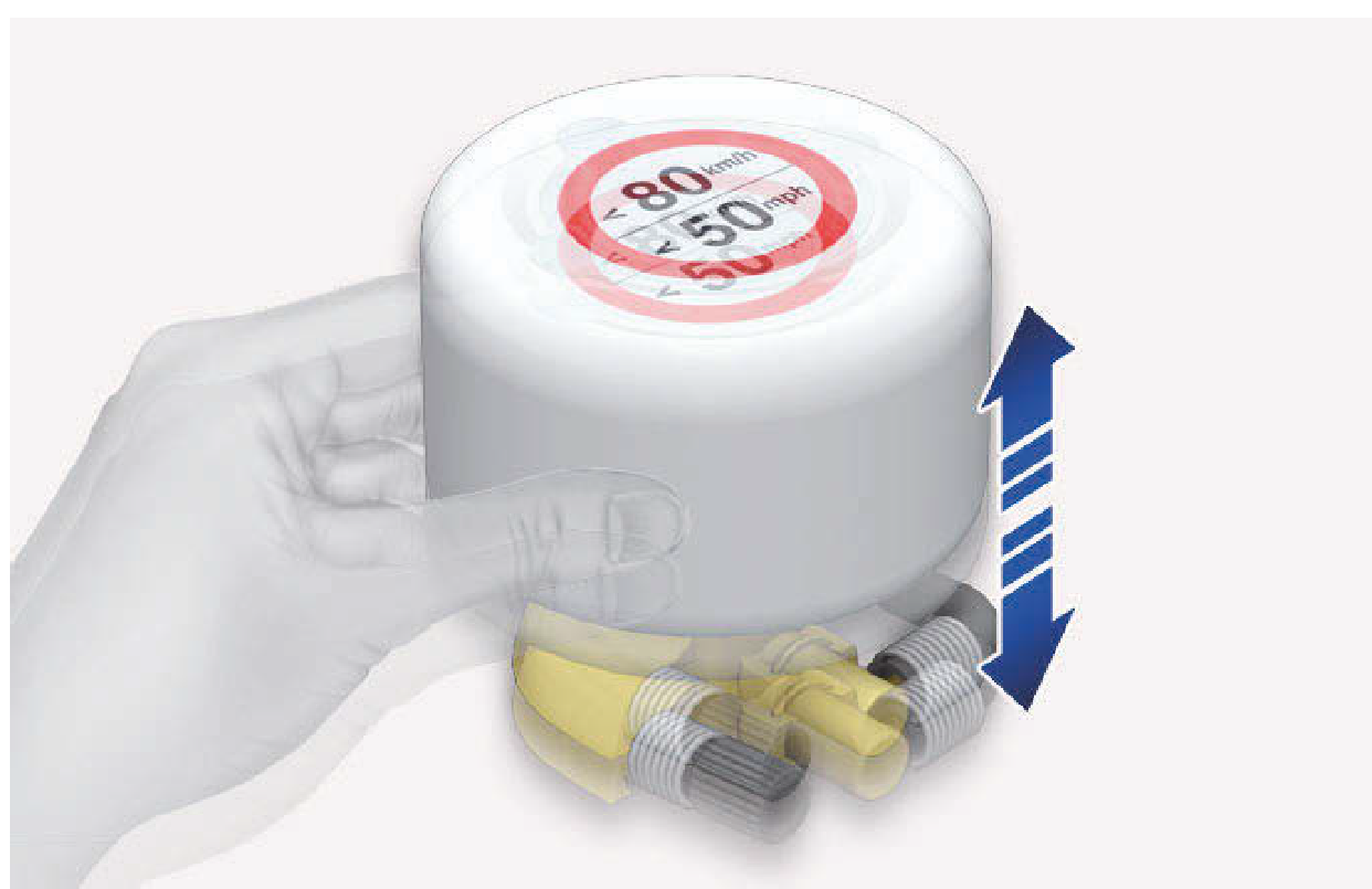 從密封劑罐(2)拆下速限標籤(1),並將標籤貼在車內容易看見的地方,例如方向盤上,以提醒駕駛人減緩速度。