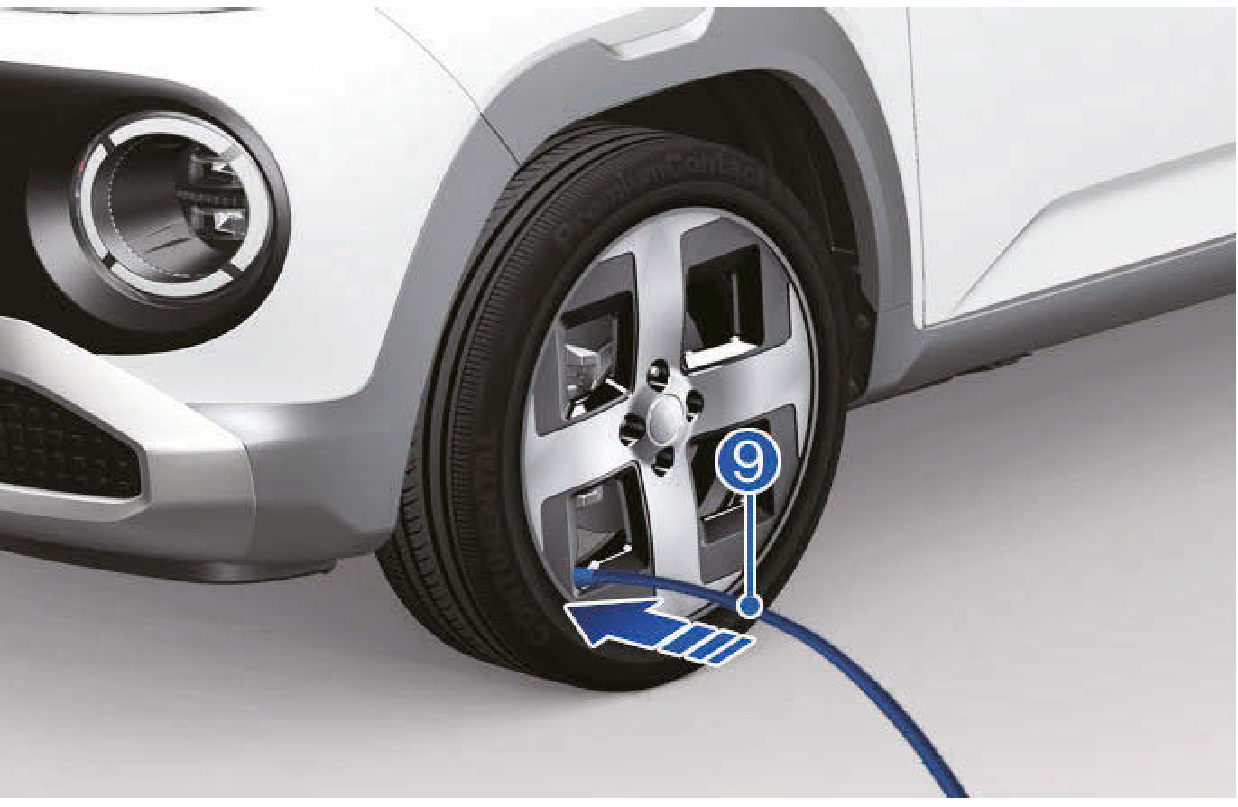 確實將密封劑充填軟管安裝到氣嘴。如果未確實安裝,密封劑可能會回流,造成充填軟管阻塞。在車輛運轉(指示燈亮起)時,打開壓縮機電源,讓壓縮機運轉大約5-7分鐘,使密封劑充填到正確的壓力(參閱第2章的 “輪胎和輪圈” 一節)。小心輪胎不可過度充氣,並在充氣時和輪胎保持距離。