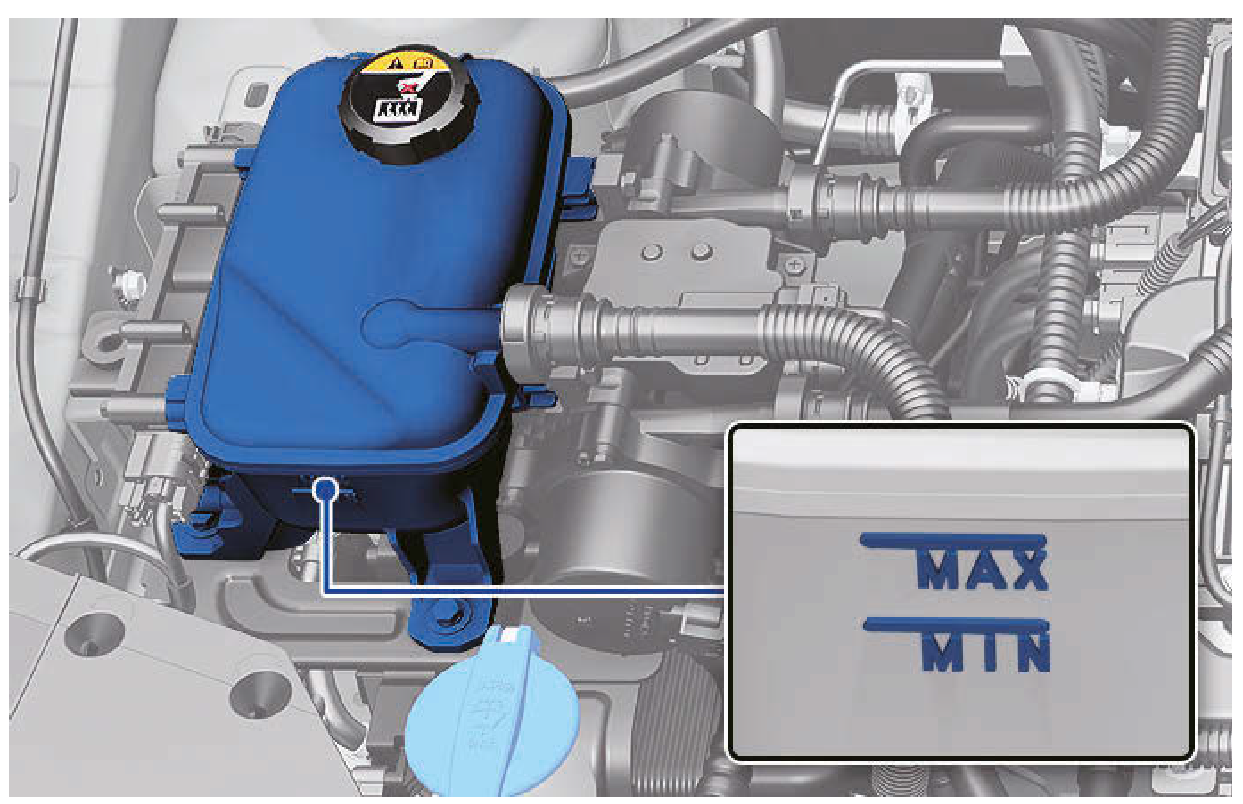 馬達室內的零件冷卻時,冷卻液量必須在冷卻液儲液筒側的MAX和MIN記號之間。