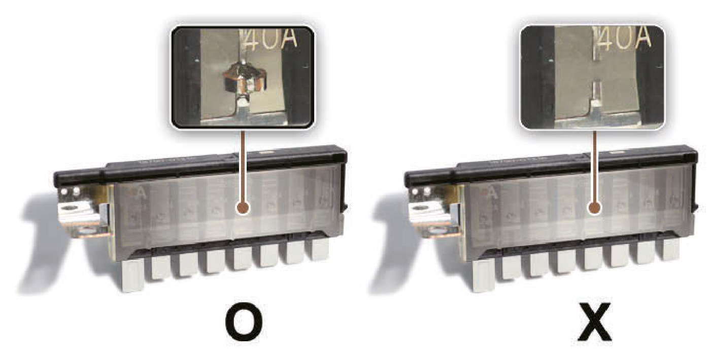 - 較高容量的保險絲可能會造成損壞並可能會導致火災。