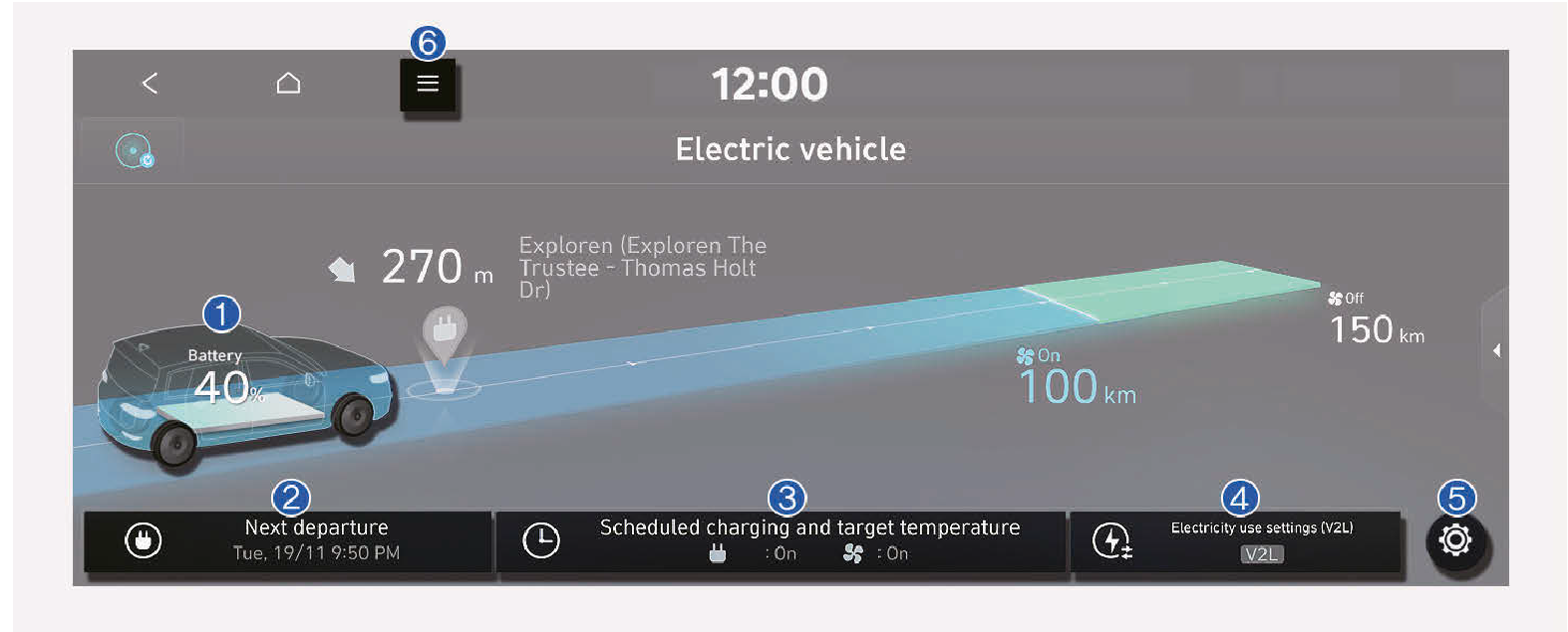 | 4 | (V2L) | 您可以設定駕駛時高壓電池的電池放電限制(%)。更多資訊,請參閱本章的 “設定使用車輛到負載(V2L)時的電池放電限制” 部分。 |