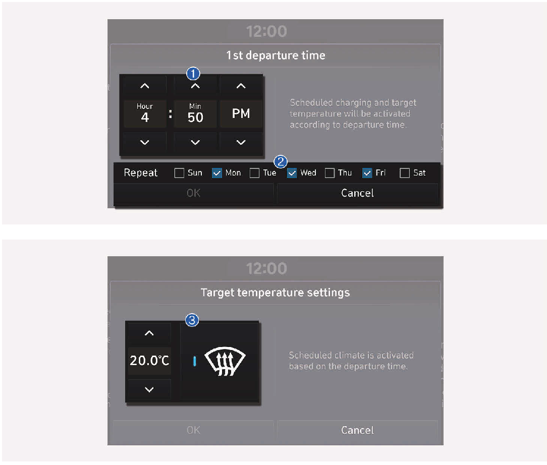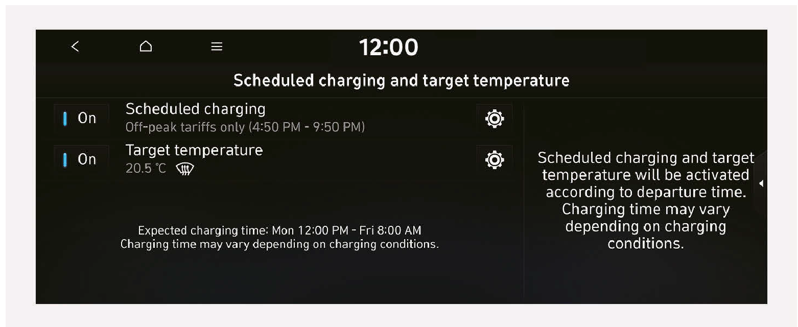 - 排程空調功能會直接使用連接的充電機/器的電源。排程空調功能可以藉由控制車輛和電池的溫度以維持舒適的環境並提升車輛性能,不需使用高壓電池的電力。