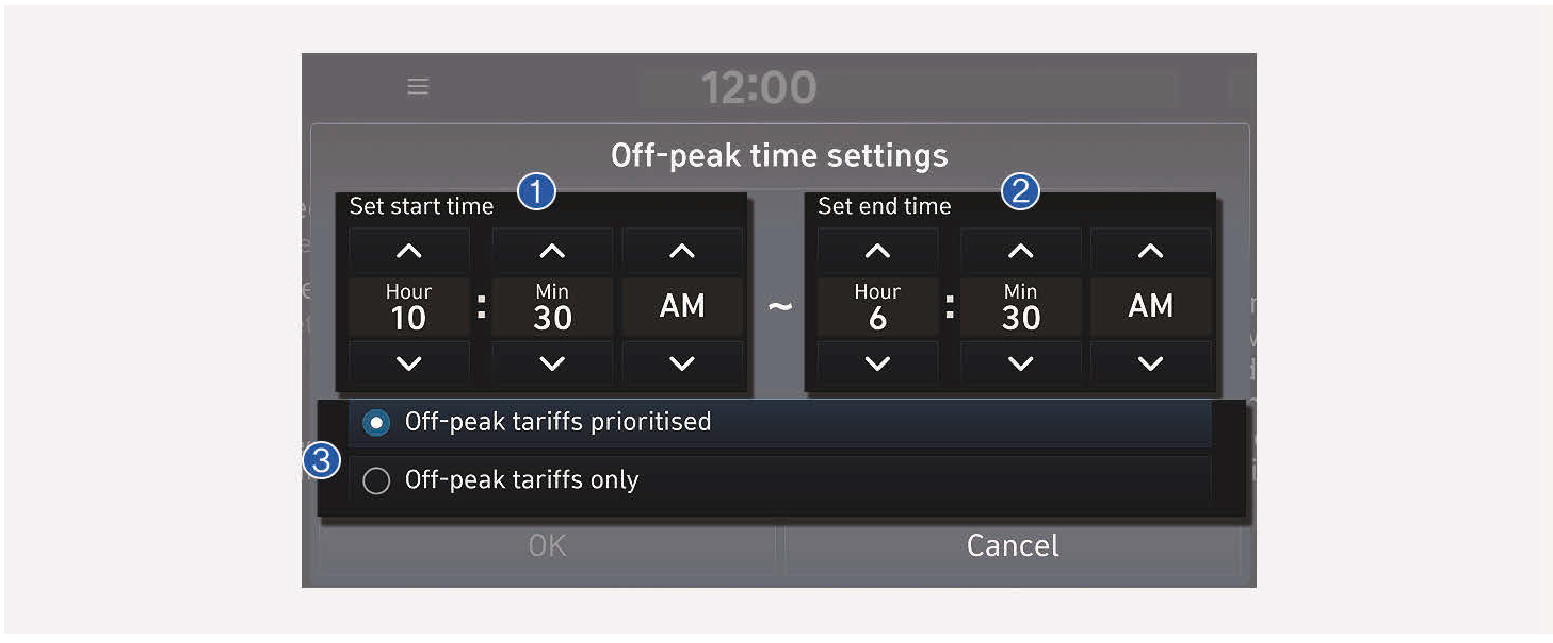 - Set start time (設定開始時間) (1):選擇此項目時,僅在指定的離峰時段開始充電。