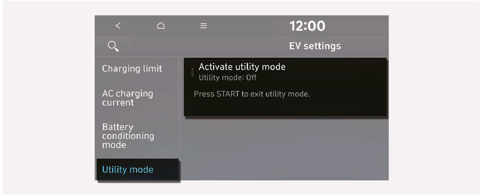 在資訊娛樂螢幕,移動到主螢幕並選擇EV > Utility mode (多功能模式),並選擇Activate Utility mode (啟用多功能模式)以啟用該功能(多功能模式:ON)。