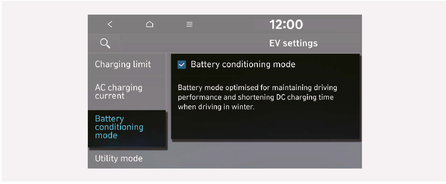 在資訊娛樂螢幕,移動到主螢幕並選擇EV > Battery conditioning mode (電池調整模式)以設定此功能。