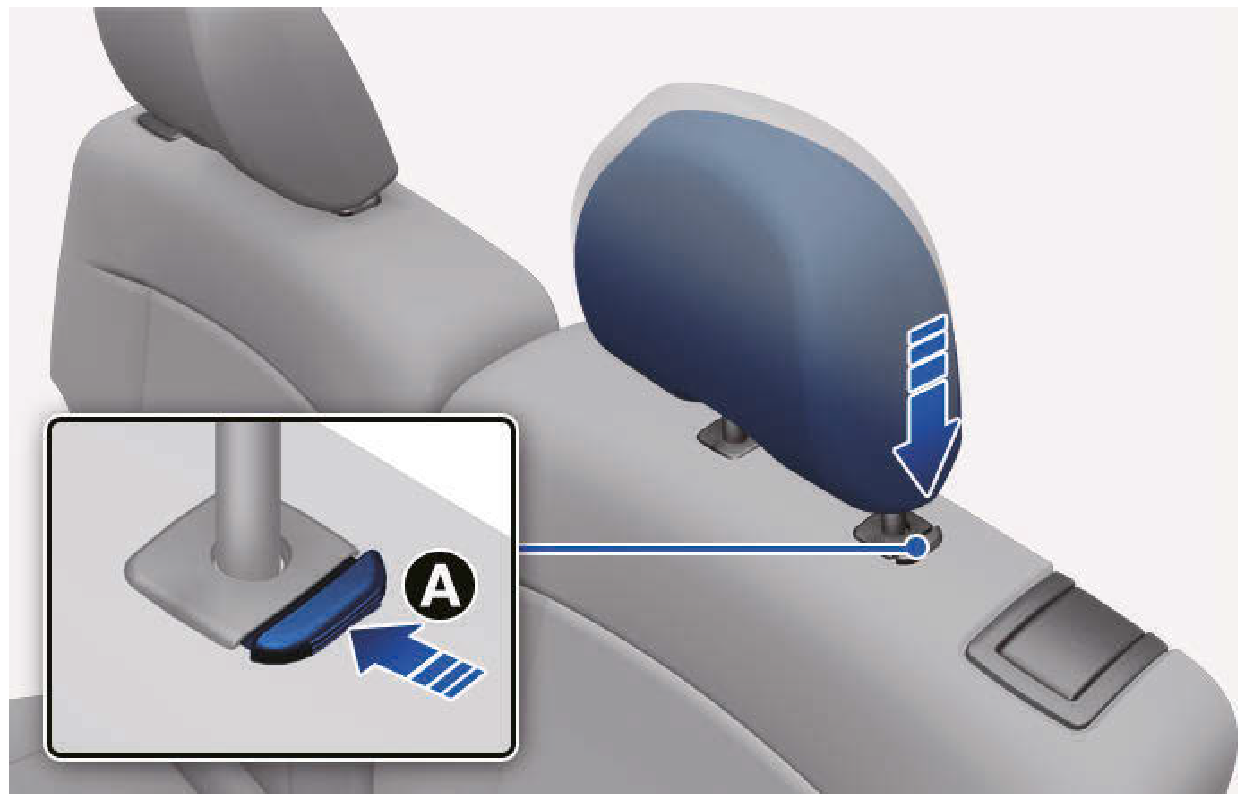 - 壓下釋放按鈕[A],並將頭枕支柱推入孔中。