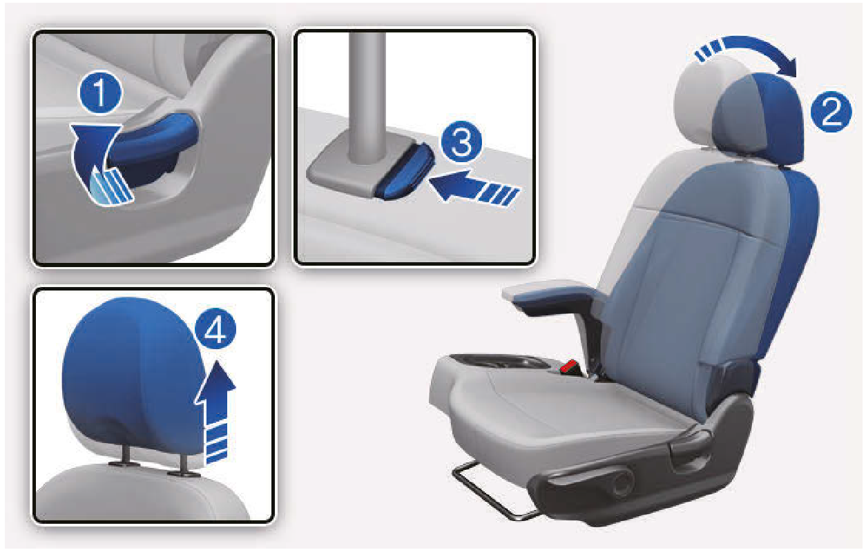 - 將頭枕上升到最高位置,並壓下頭枕釋放按鈕(3),以拆下頭枕(4)。