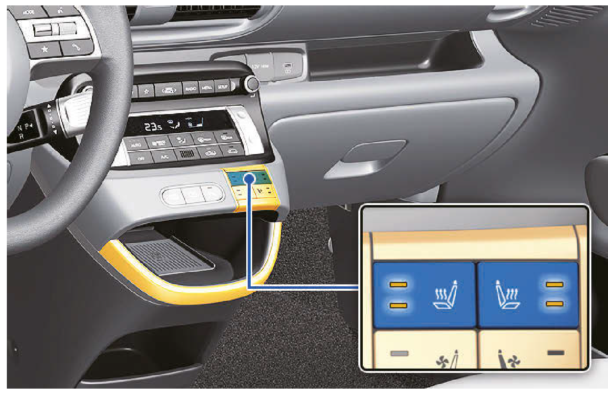 - 座椅加溫器的溫度會自動降低,並在特定的時間後關閉,以防止低溫燙傷。如果座椅加溫器關閉後再次選擇高溫,則會再次自動控制溫度。