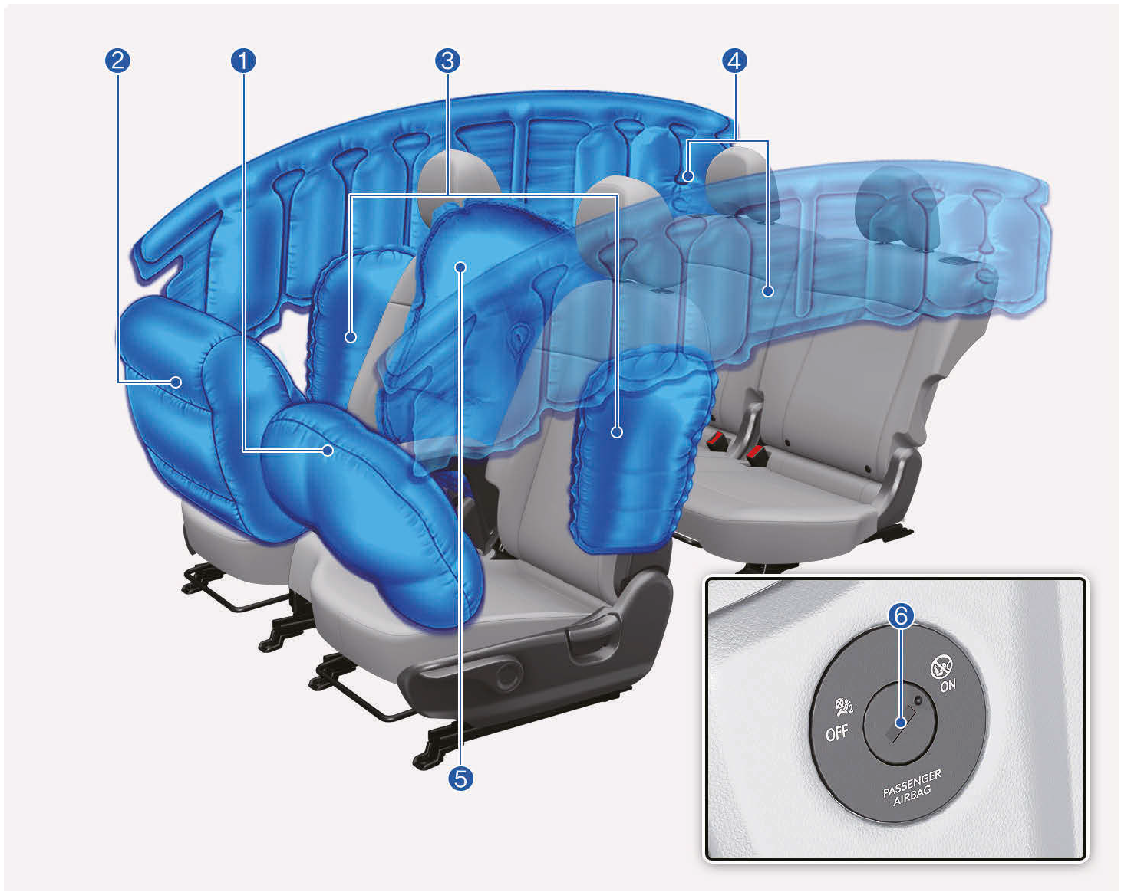 前氣囊設計用於輔助三點式安全帶。為了讓氣囊發揮保護作用,車輛駕駛時必須隨時繫上安全帶。