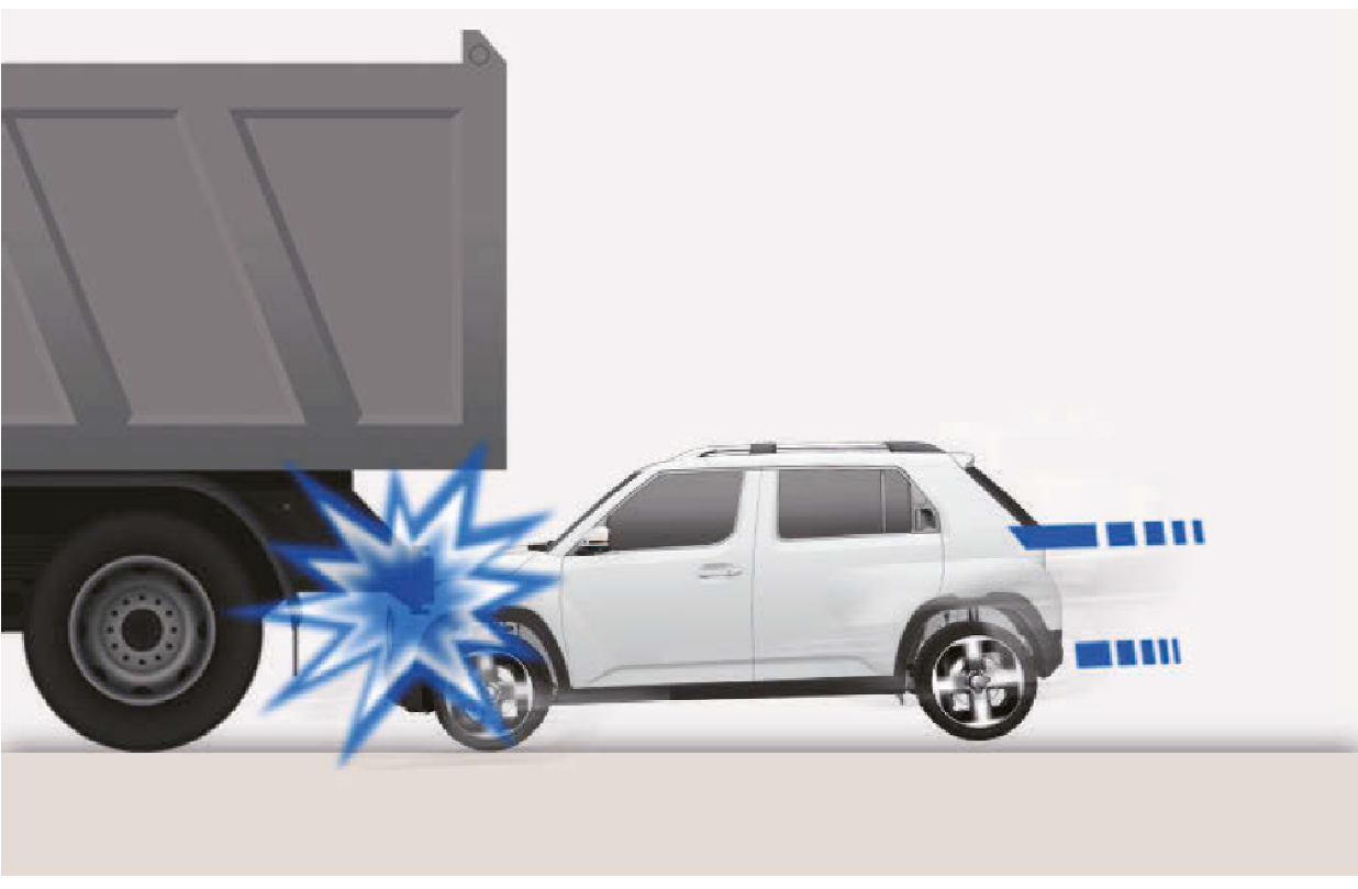 撞擊之前,駕駛人通常會重踩煞車。如此的重踩煞車會使車輛前方往下沉,造成車頭 “鑽撞” 到距地間隙較高車輛的下方。在這種 “鑽撞” 的狀況下,因為感知器偵測到減速的力量明顯的因為這種 “鑽撞” 的撞擊而減少,因此氣囊可能不會展開。