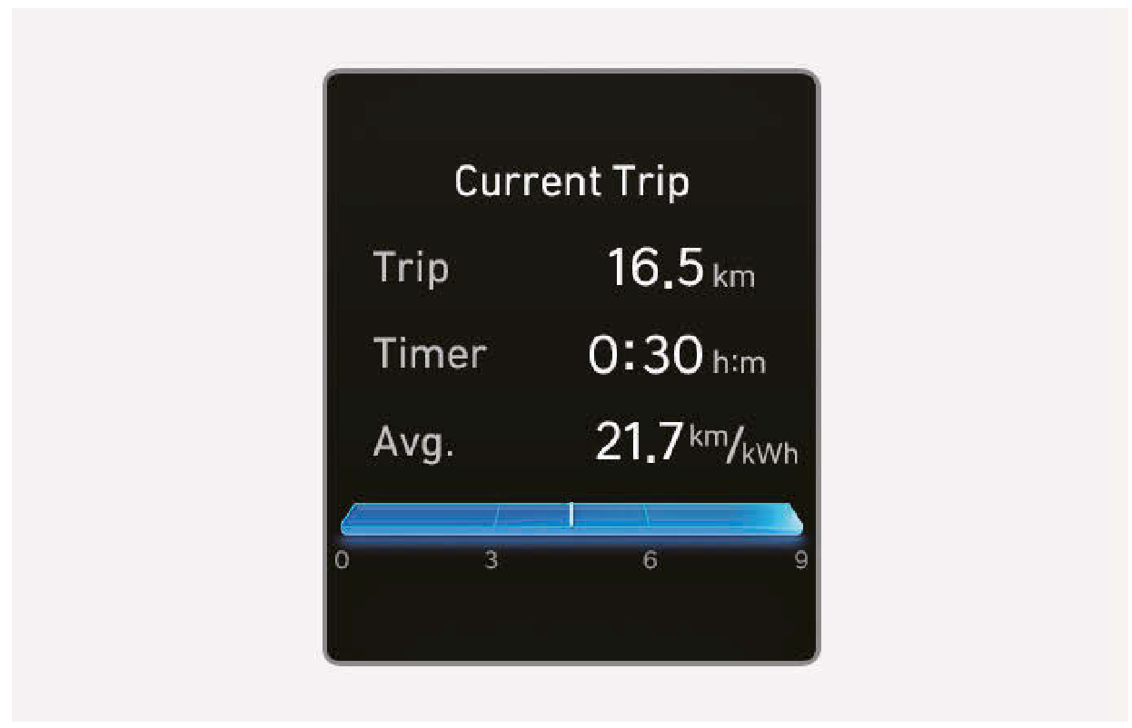 旅程距離、總駕駛時間、平均能量消耗和即時能量消耗會顯示。