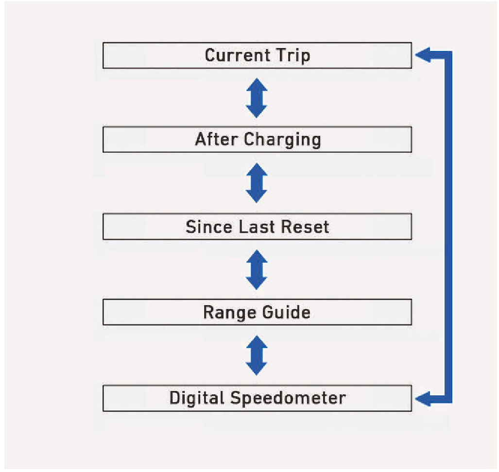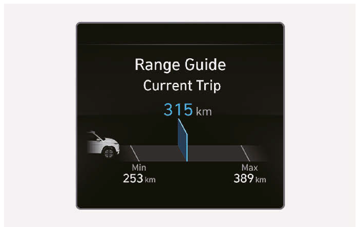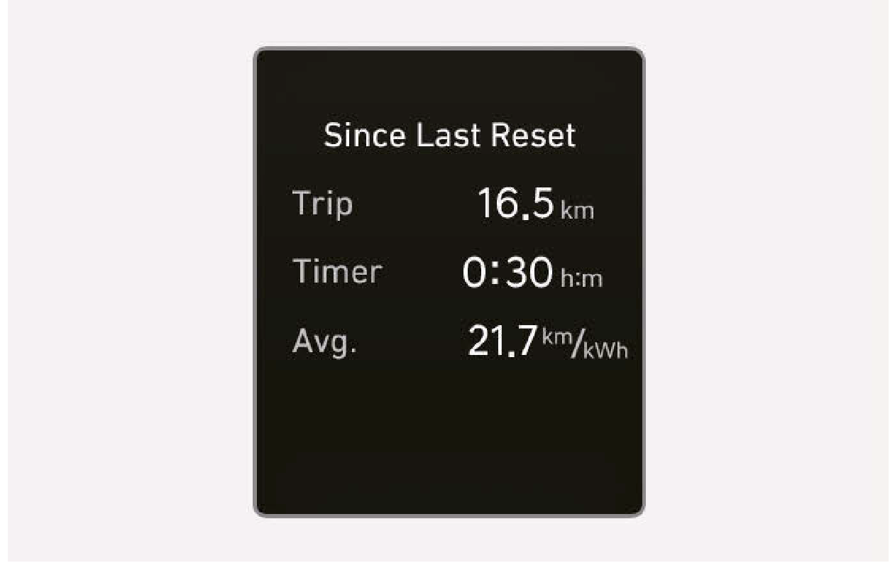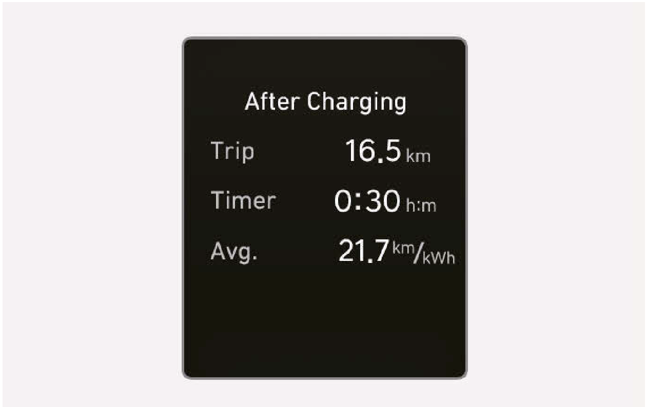 車輛充電後的旅程距離、總駕駛時間、平均能量消耗和即時能量消耗會顯示。欲手動重設時,可在 “After Charging” 顯示時,按下方向盤上的OK按鈕1秒以上。