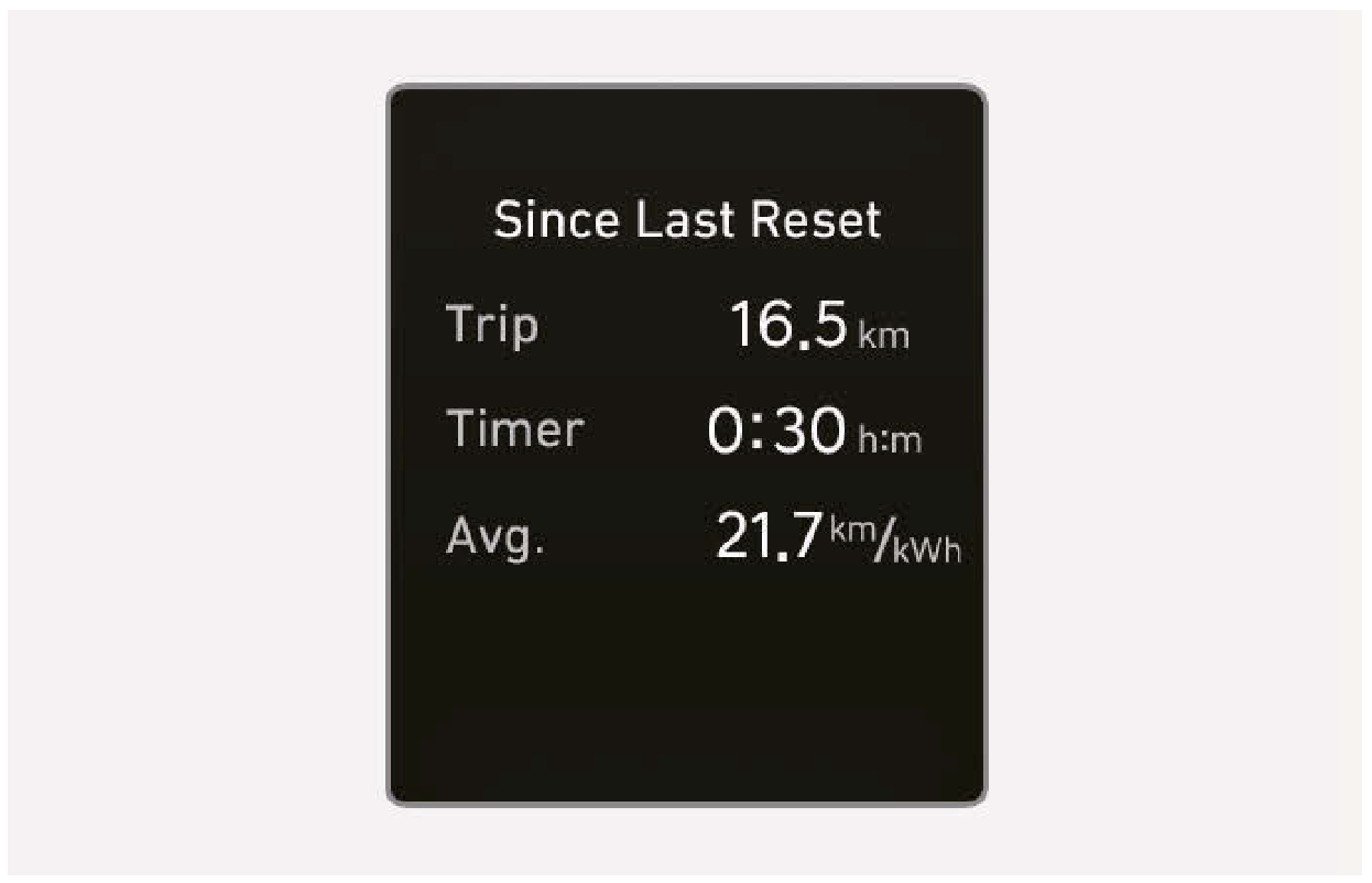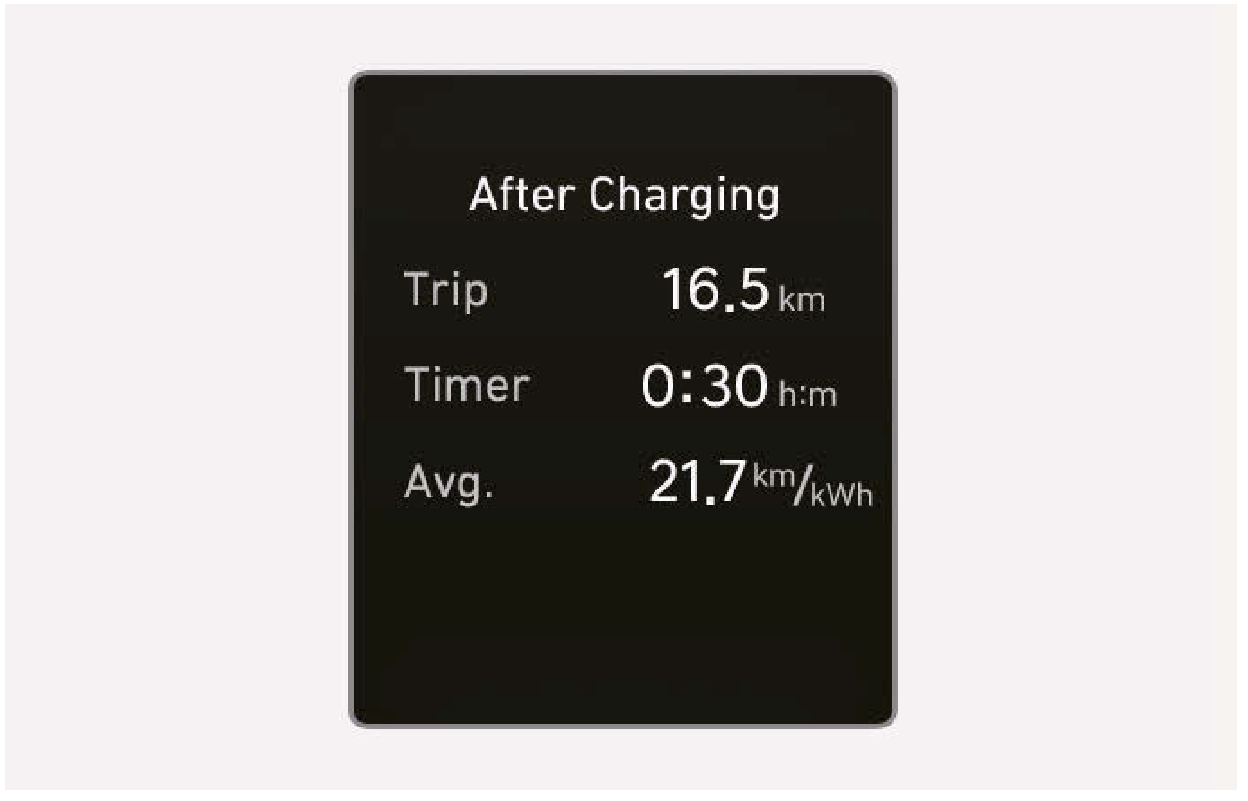 車輛充電後的旅程距離、總駕駛時間、平均能量消耗和即時能量消耗會顯示。欲手動重設時,可在 “After Charging” 顯示時,按下方向盤上的OK按鈕1秒以上。