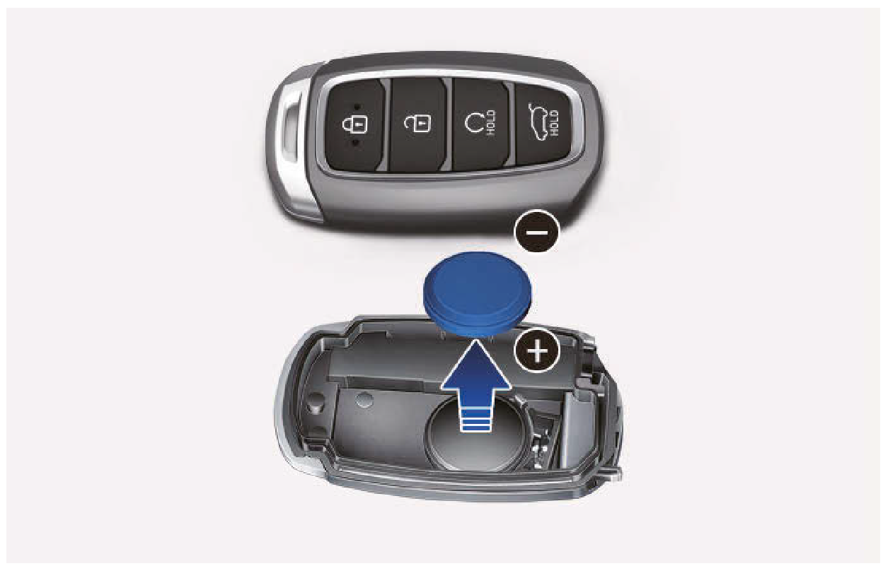 - 取出舊電池,並插入新電池。確認電池位置是否正確。電池位置不正確可能會造成電池放電,因而導致智慧型鑰匙故障。