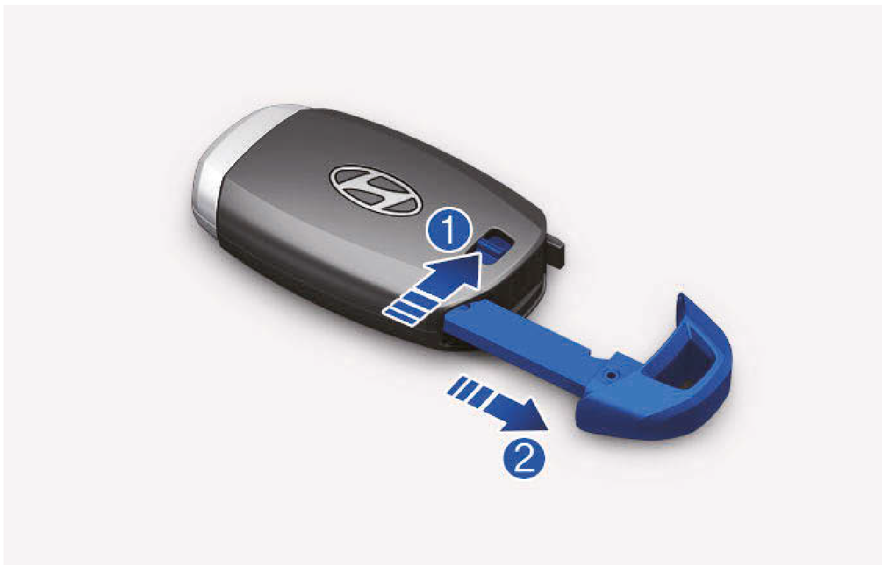 將釋放鈕沿著箭頭(1)方向移動,然後取出機械鑰匙(2)。將機械鑰匙插入車門的鑰匙孔。