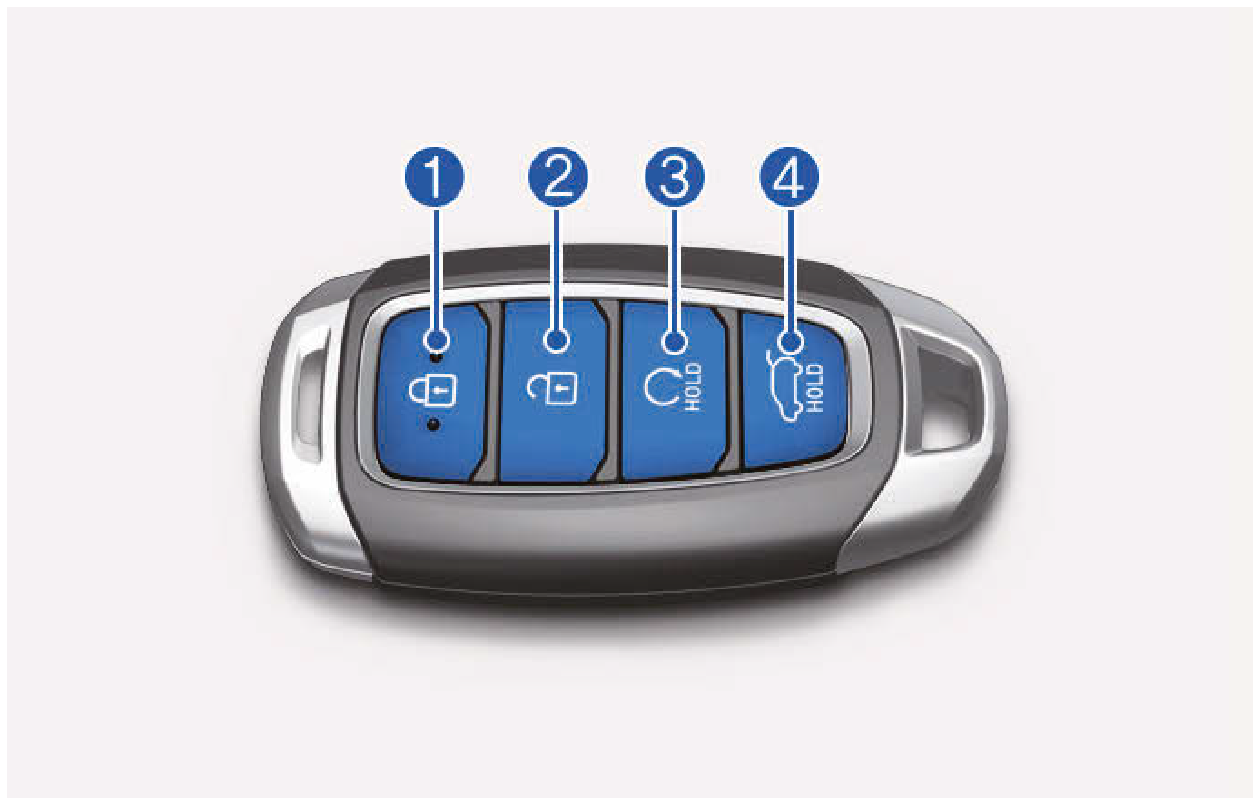 - 按下尾門把手按鈕或按下智慧型鑰匙上的開鎖按鈕(4) 1秒以上。