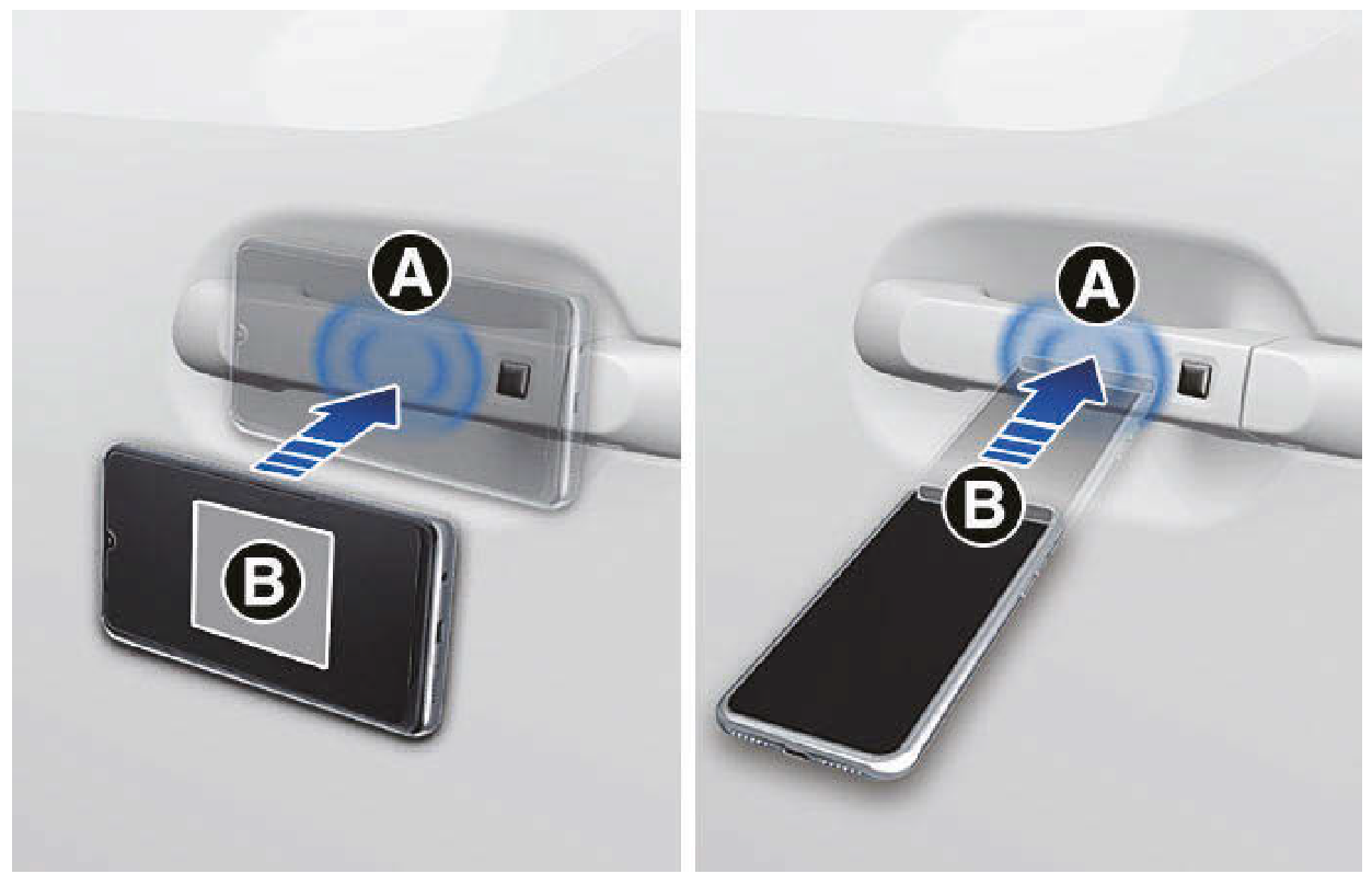 - 駕駛人將數位鑰匙(智慧型手機)貼近駕駛側或乘客側車門把手驗證板[A] 2秒以上時,車門將會上鎖或開鎖。