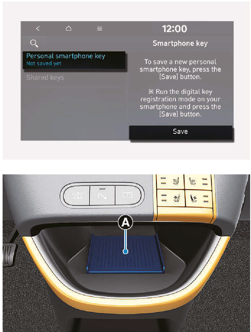 - 將註冊的數位鑰匙(智慧型手機)放在車輛驗證板(無線充電板)上後,踩下煞車踏板並按下啟動/熄火按鈕。