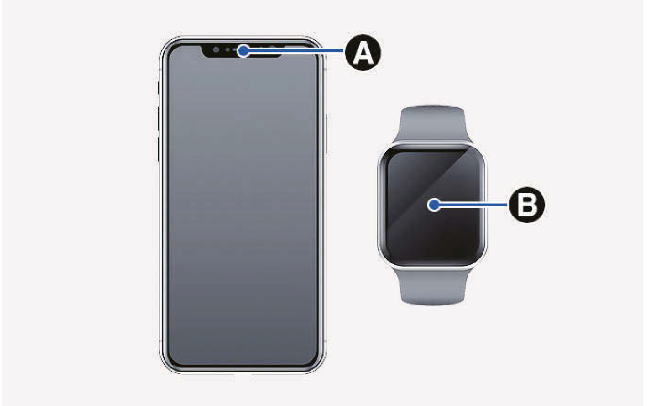 Apple iPhone的NFC天線位置位於後上方[A],Apple WATCH的NFC天線位置位於螢幕中央[B]。