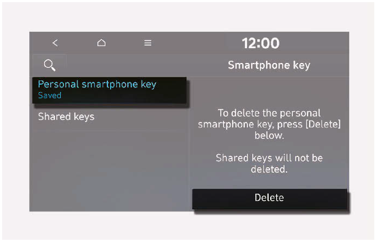 - 從 “Personal smartphone key (個人智慧型手機鑰匙)” 選單刪除現有的數位鑰匙(智慧型手機)後,即可註冊新的智慧型手機。(若有配備)