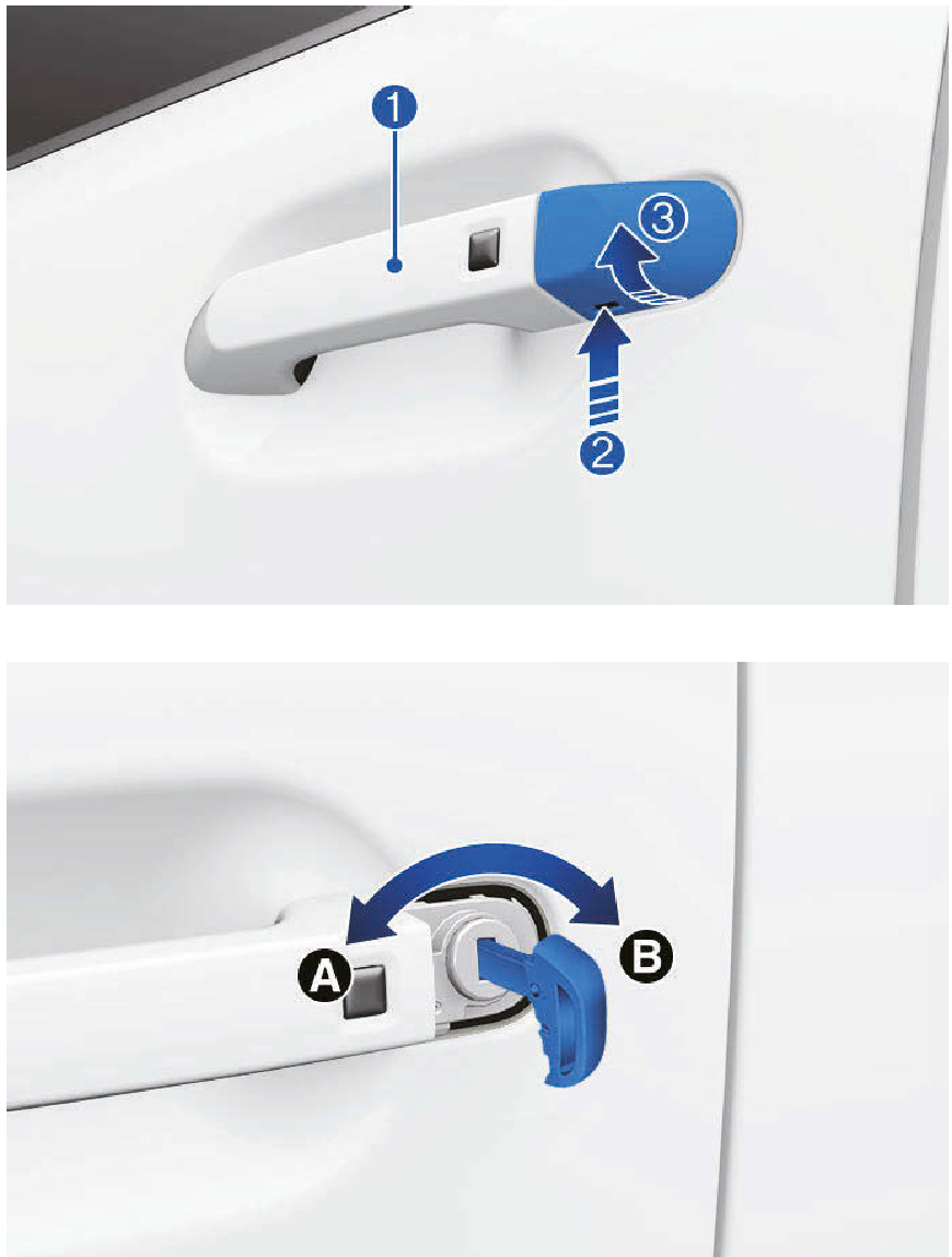- 將機械鑰匙插入鎖芯並順時針轉動[B],將車輛開鎖,或逆時針轉動[A],將車輛上鎖。 車門開鎖後,拉動車門把手即可將車門打開。