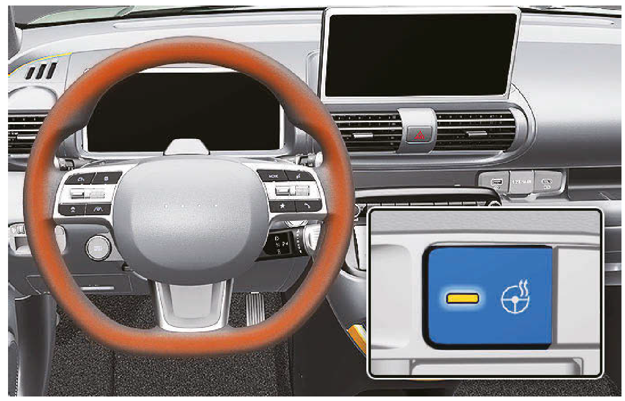啟動/熄火按鈕在ON位置或車輛在就緒模式(指示燈亮起)時,按下方向盤加熱器按鈕可加熱方向盤。按鈕上的指示燈會亮起。 欲關閉方向盤加熱器功能時,再次按下按鈕。按鈕上的指示燈將會熄滅。 方向盤加熱器功能啟動約30分鐘後,方向盤加熱器功能將會自動關閉。
