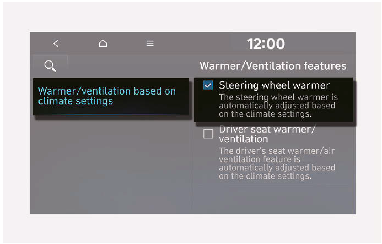 - 按下SETUP按鈕,然後選擇Vehicle (車輛) > Seat (座椅) > Warmer/ Ventilation features (加溫器/通風功能) > Warmer/ventilation based on climate settings (恆溫設定連動加溫器/通風)。
