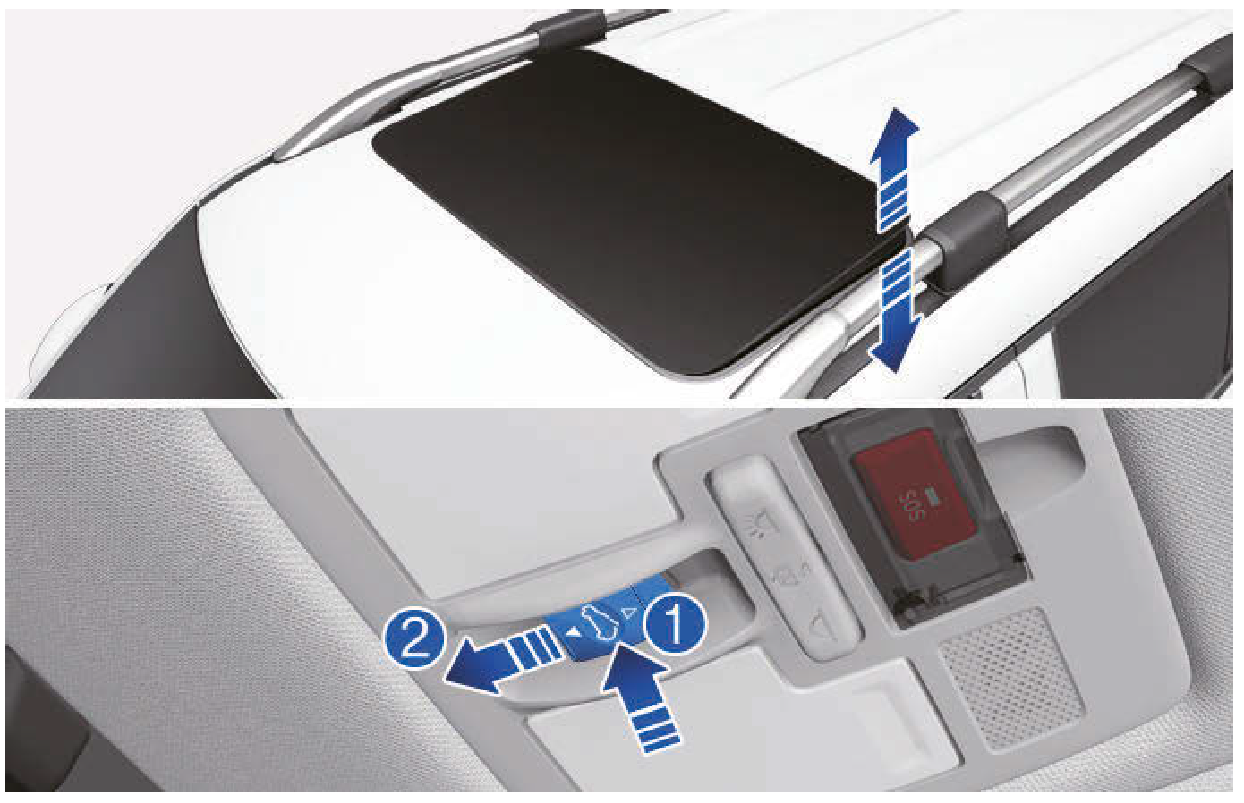 天窗玻璃無法同時滑動打開和傾斜打開。天窗玻璃滑動打開時,天窗玻璃無法傾斜打開。此外,天窗傾斜打開時,天窗玻璃也無法滑動打開。天窗玻璃完全關閉時,可以和天窗玻璃一起滑動打開或傾斜打開。