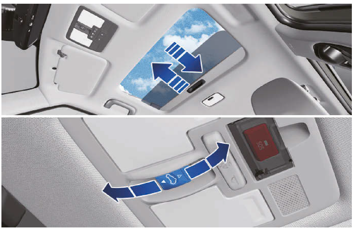 - 將天窗開關向後推時,遮陽板和天窗玻璃會滑動打開。