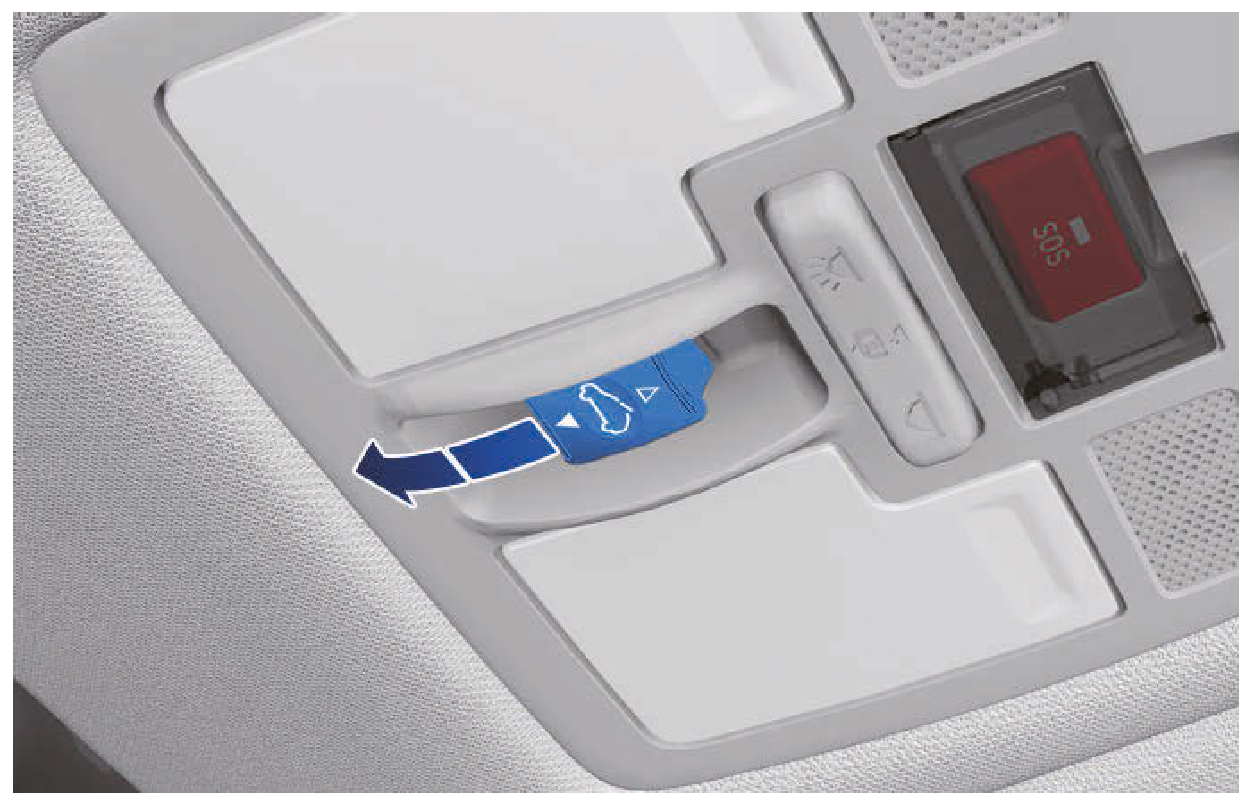 - 再次將天窗開關向前推住,直到天窗玻璃滑動打開和關閉。操作完成之前,不可釋放開關。