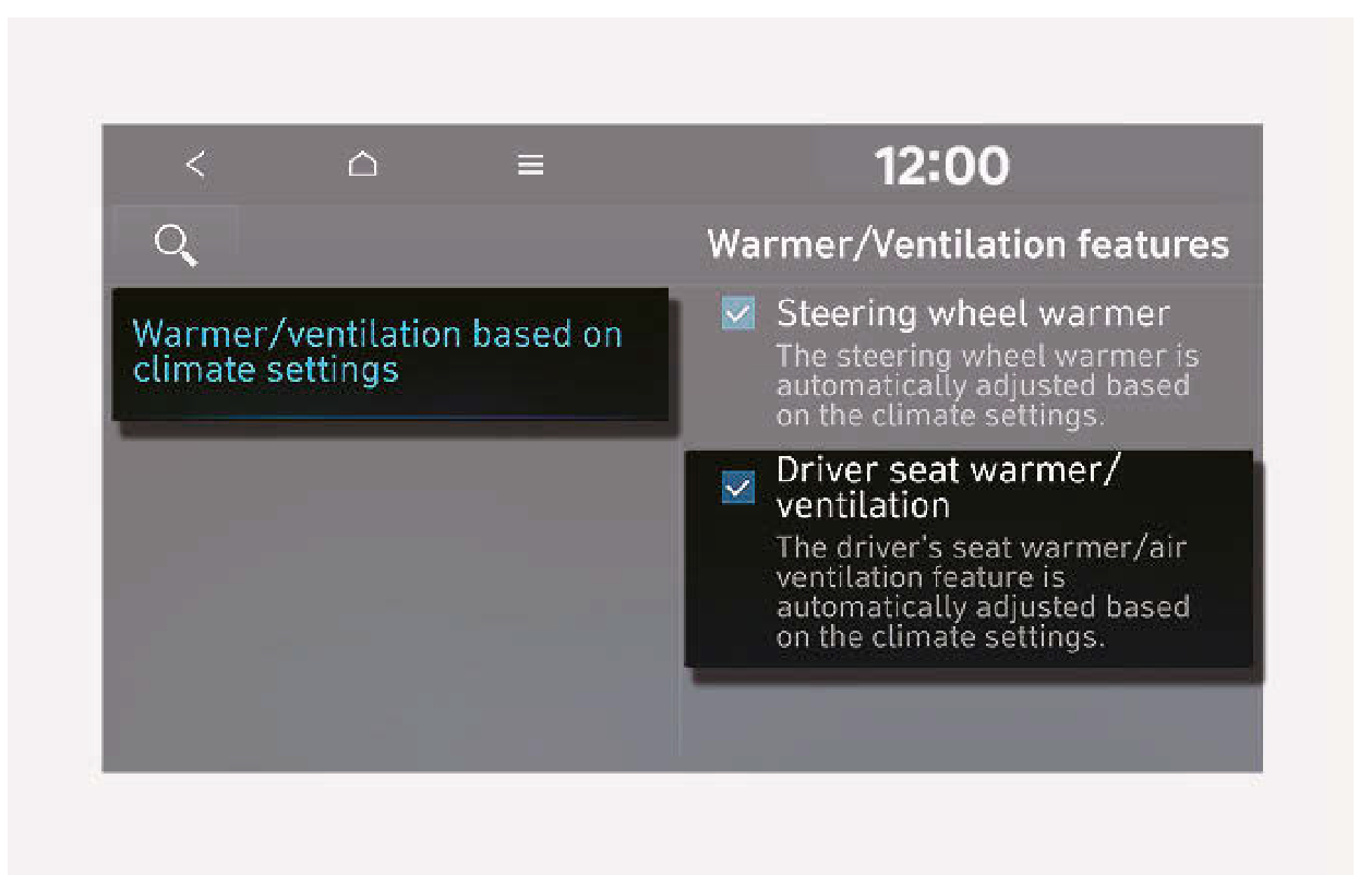 - 按下SETUP按鈕,然後選擇Vehicle (車輛) > Seat (座椅) > Warmer/ Ventilation features (加溫器/通風功能) > Warmer/ventilation based on climate settings (恆溫設定連動加溫器/通風)