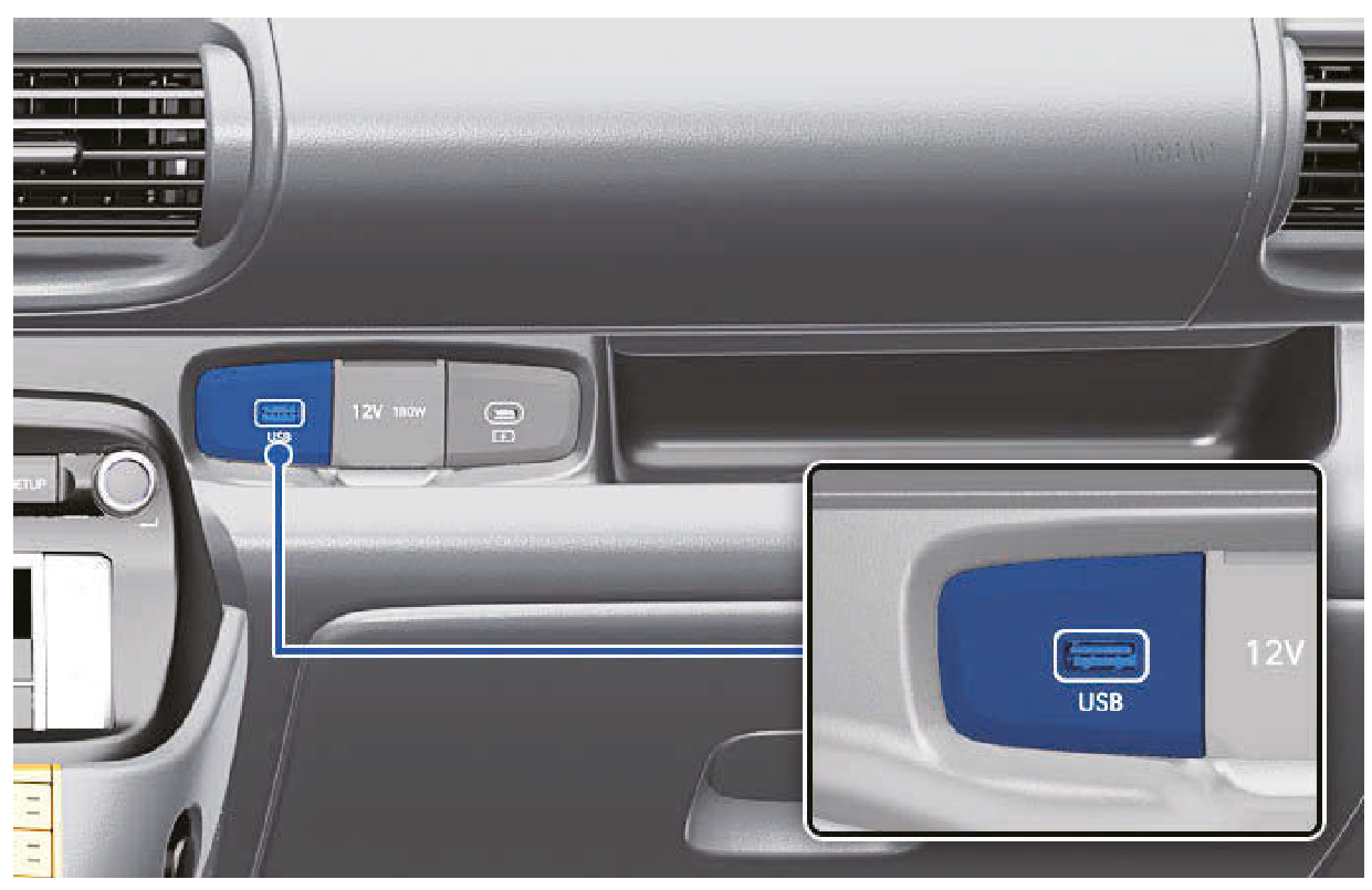 - 將MP3或USB等媒體儲存裝置連接到USB連接埠後,您可以經由車輛的揚聲器聆聽音樂或在資訊娛樂系統播放音樂。