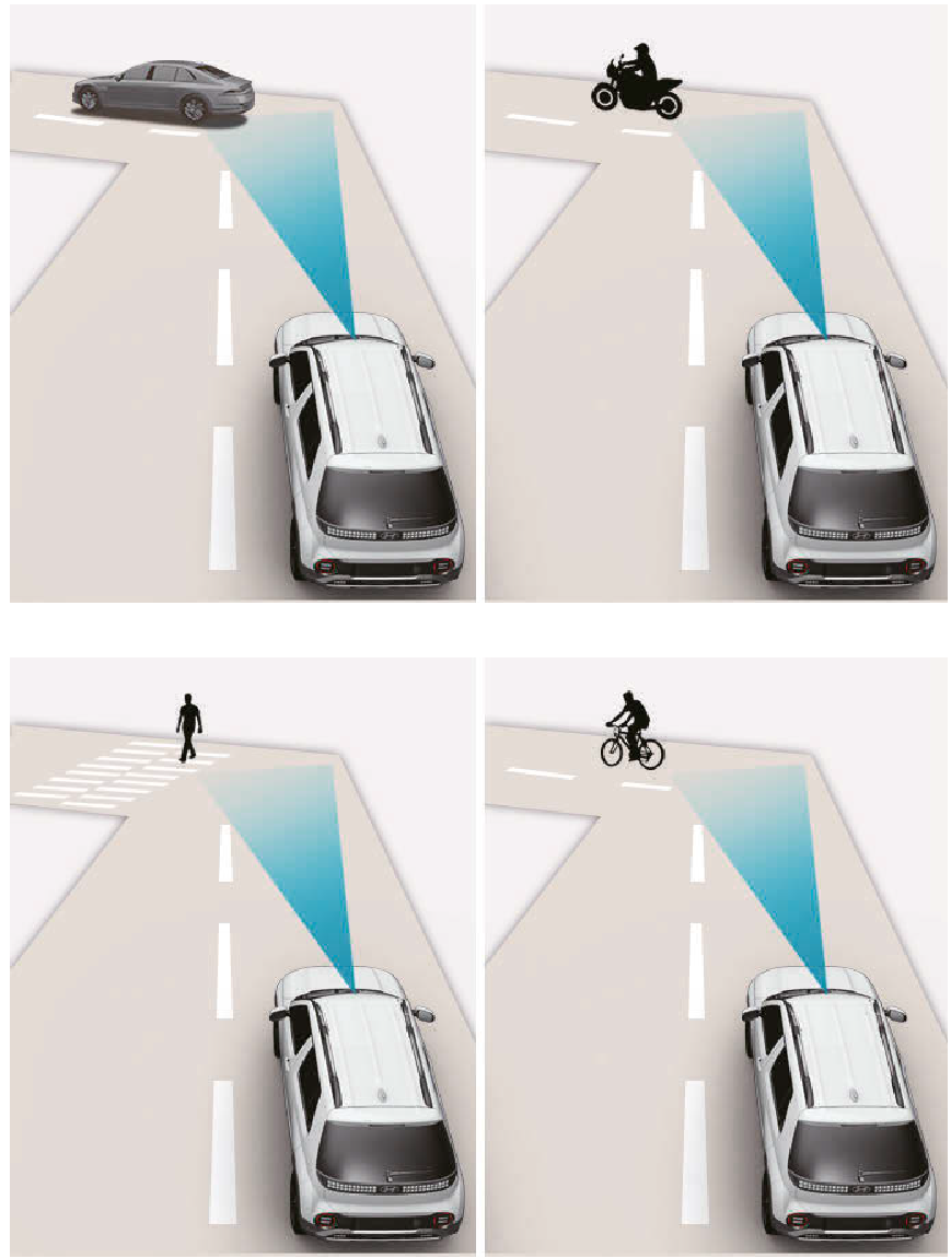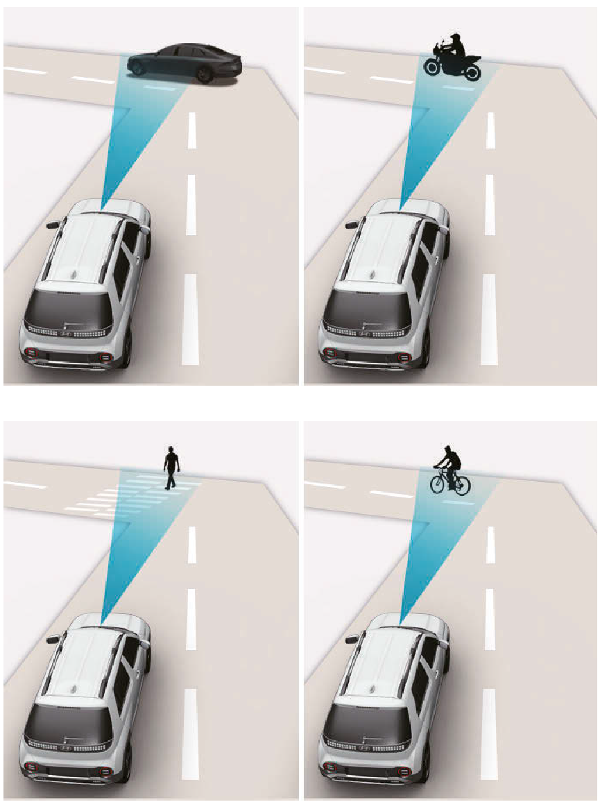 - 如果偵測到形狀或特性和車輛、機車騎士、行人及自行車相似的物體,前方碰撞避免輔助可能會操作。