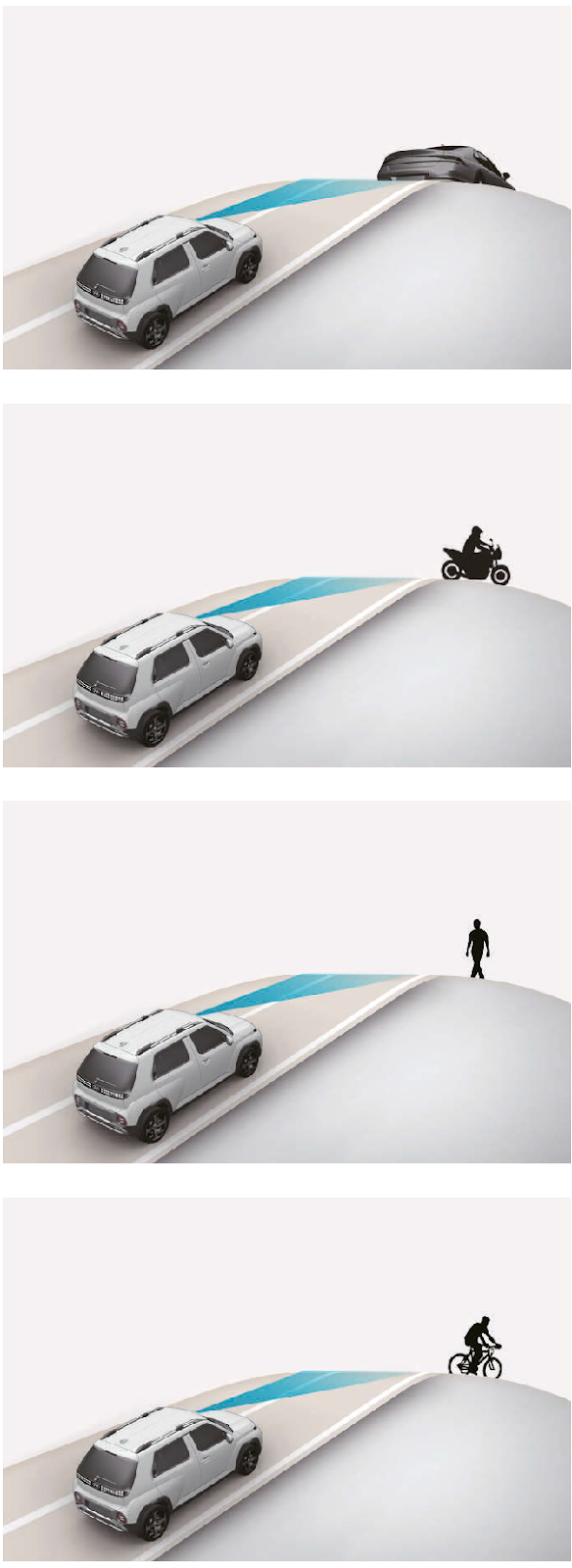 在會對感知器性能產生不利影響的上坡或下坡駕駛時,前方碰撞避免輔助可能無法偵測到前方其他的車輛、機車騎士、行人或自行車騎士。