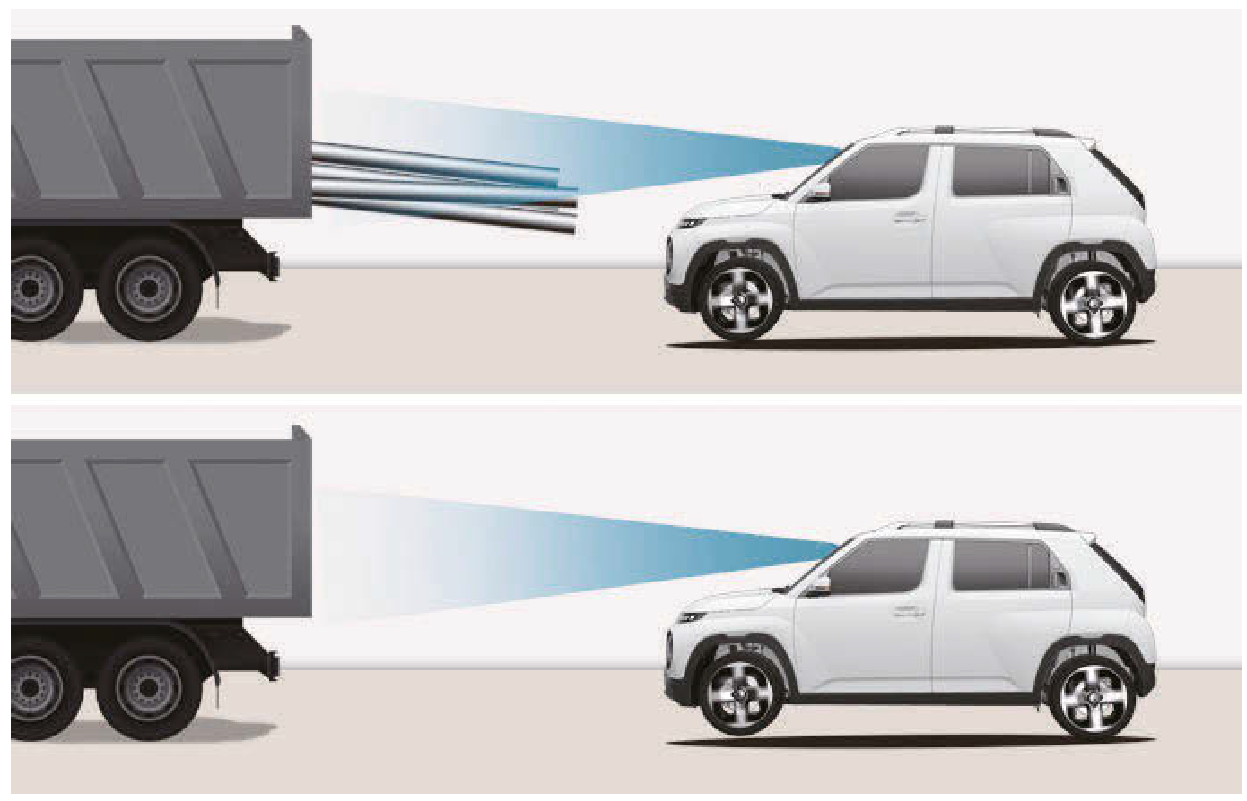 如果您前方車輛裝載的貨物超出車身,或您前方車輛的離地間隙較高時,必須特別注意。前方碰撞避免輔助可能無法偵測到超出車輛車身的貨物。在這些狀況下,您必須和最後方的物體維持安全的煞車距離,並依需要控制車輛並踩下煞車踏板,降低駕駛速度,以維持安全距離。