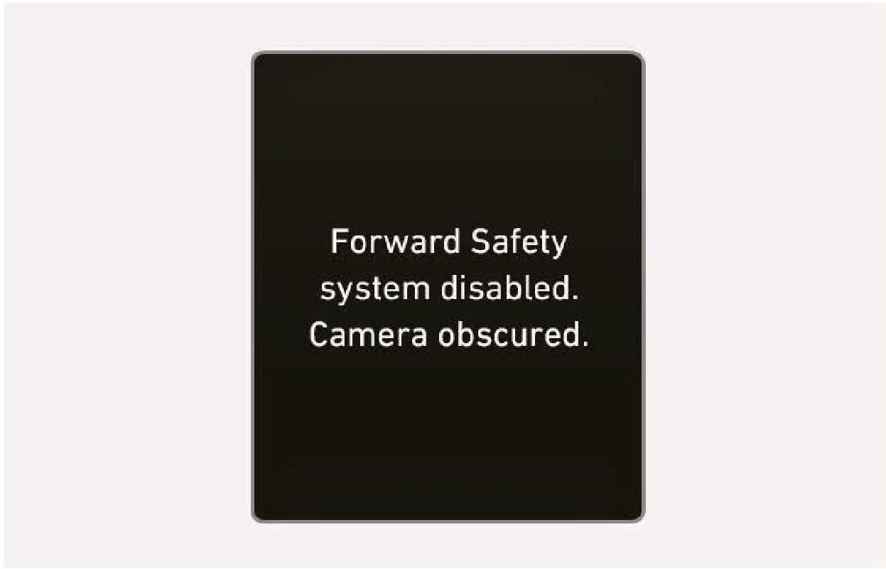 如果發生此狀況,“Forward Safety system disabled. Camera obscured.” 警告訊息將會顯示,且和警告燈會在儀錶組顯示器亮起。 積雪、雨水或異物清除後,前方碰撞避免輔助將會正常操作。