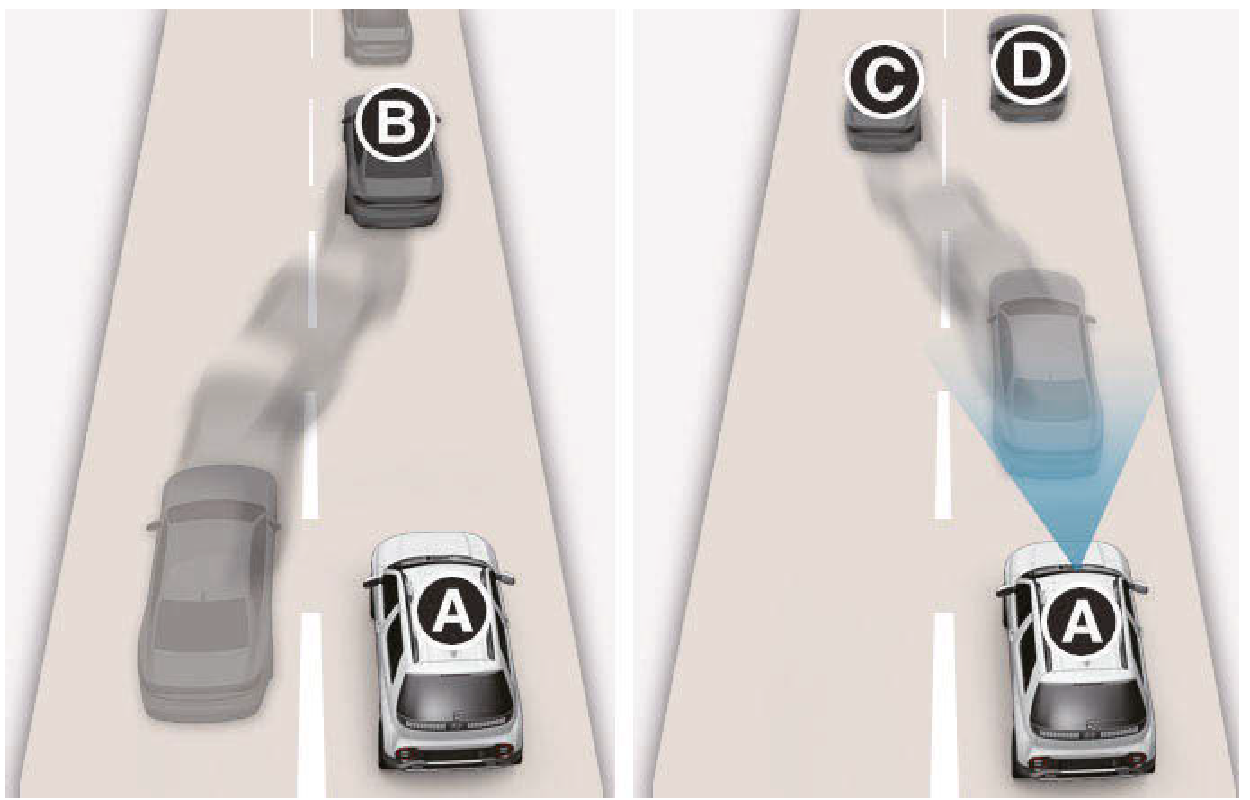 [D] 變換車道的車輛有車輛從鄰近車道切入您的車道時,直到該車輛進入感知器的偵測範圍之前,感知器無法偵測到車輛。車輛突然變換車道時,前方碰撞避免輔助可能無法立即偵測到車輛。在此狀況下,您必須維持安全的煞車距離,並依需要控制車輛並踩下煞車踏板,降低駕駛速度,以維持安全距離。