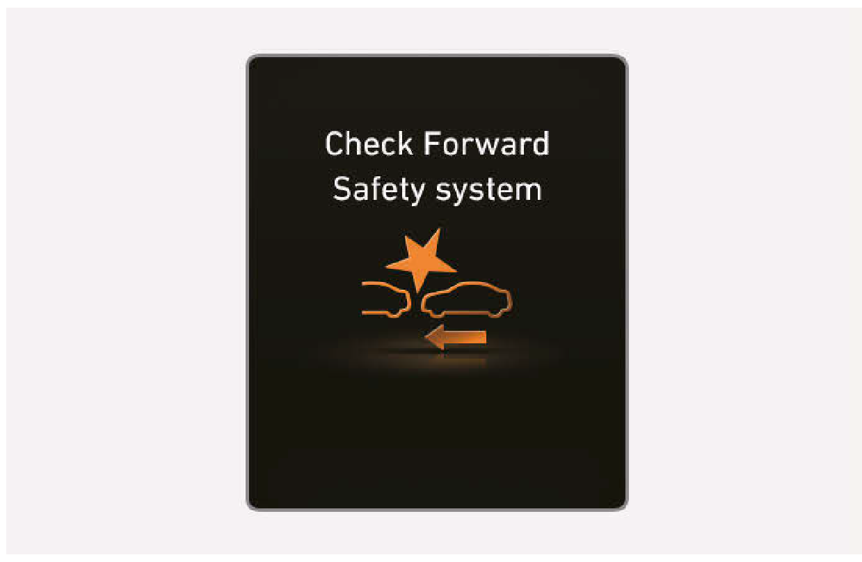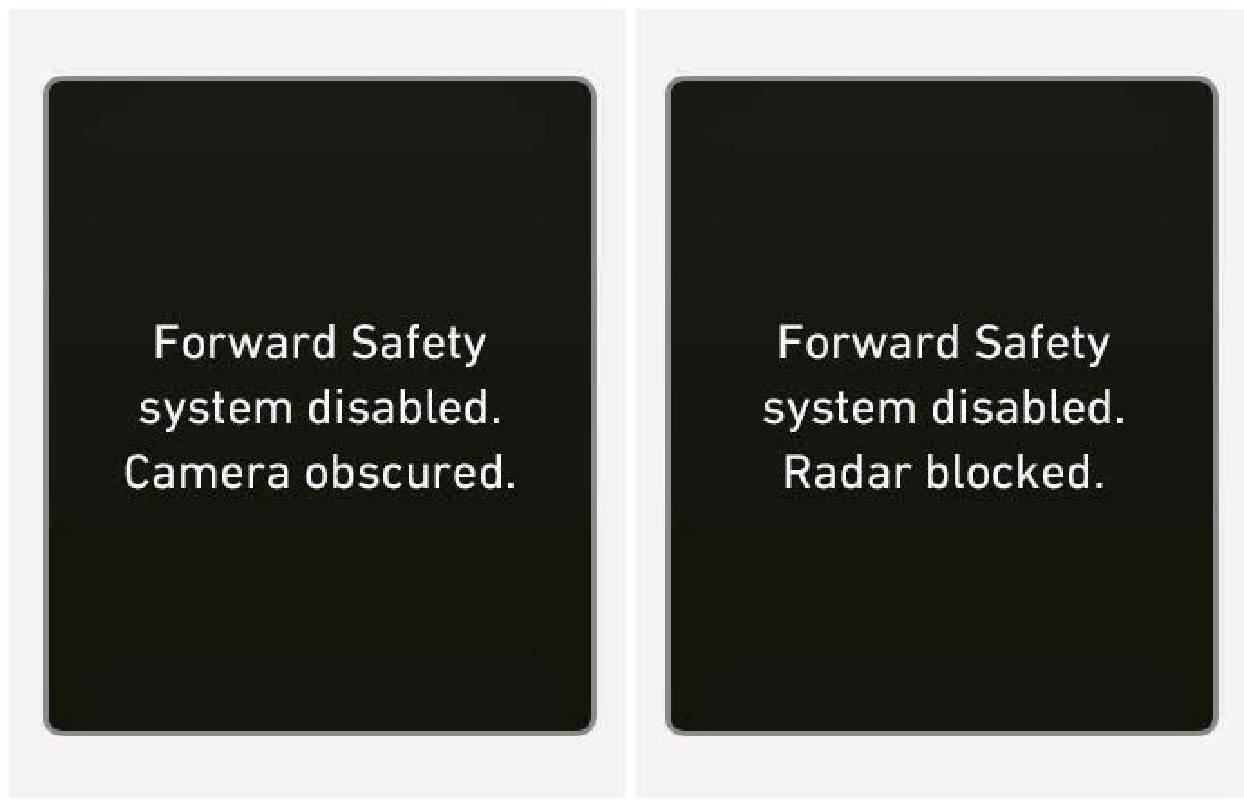 如果發生此狀況,“Forward Safety system disabled. Camera obscured.” 或 “Forward Safety system disabled. Radar blocked.” 警告訊息以及、 或警告燈會在儀錶組亮起。