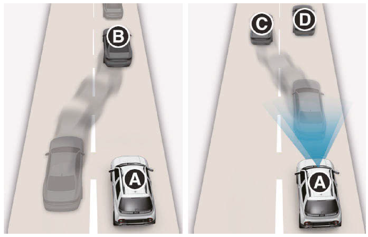 [D] 同一車道的車輛或機車騎士在有車輛或機車從鄰近車道切入您的車道時,直到該車輛進入感知器的偵測範圍之前,感知器無法偵測到車輛或機車。車輛或機車騎士突然變換車道時,前方碰撞避免輔助可能無法立即偵測到車輛或機車騎士。在此狀況下,您必須維持安全的煞車距離,並依需要控制車輛並踩下煞車踏板,降低駕駛速度,以維持安全距離。