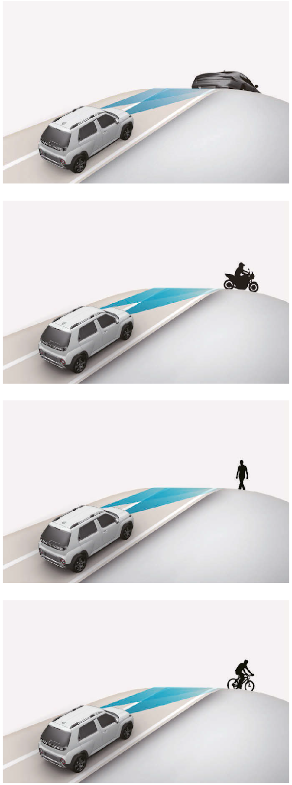 在會對感知器性能產生不利影響的上坡或下坡駕駛時,前方碰撞避免輔助可能無法偵測到前方其他的車輛、機車騎士、行人或自行車騎士。