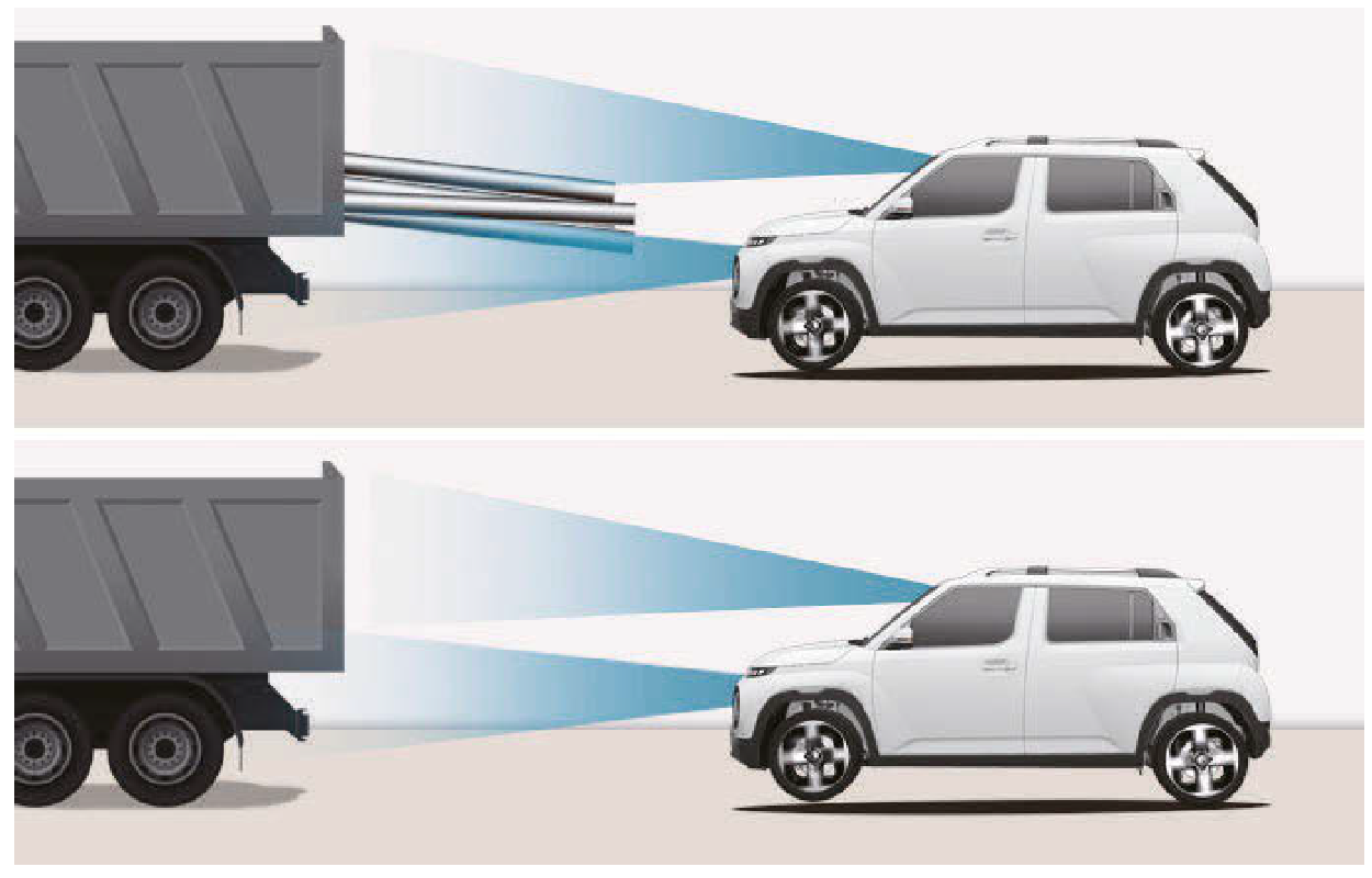 如果您前方車輛裝載的貨物超出車身,或您前方車輛的離地間隙較高時,必須特別注意。前方碰撞避免輔助可能無法偵測到超出車輛車身的貨物。在這些狀況下,您必須和最後方的物體維持安全的煞車距離,依需要控制車輛並踩下煞車踏板,降低駕駛速度,以維持安全距離。
