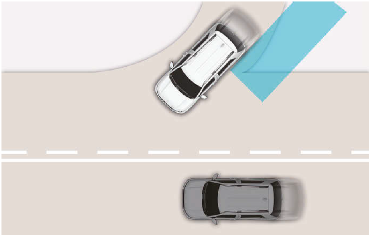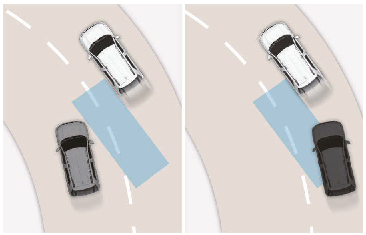 在彎道上駕駛時,盲點碰撞避免輔助可能無法正常操作。此功能可能會偵測到同一車道內的車輛。