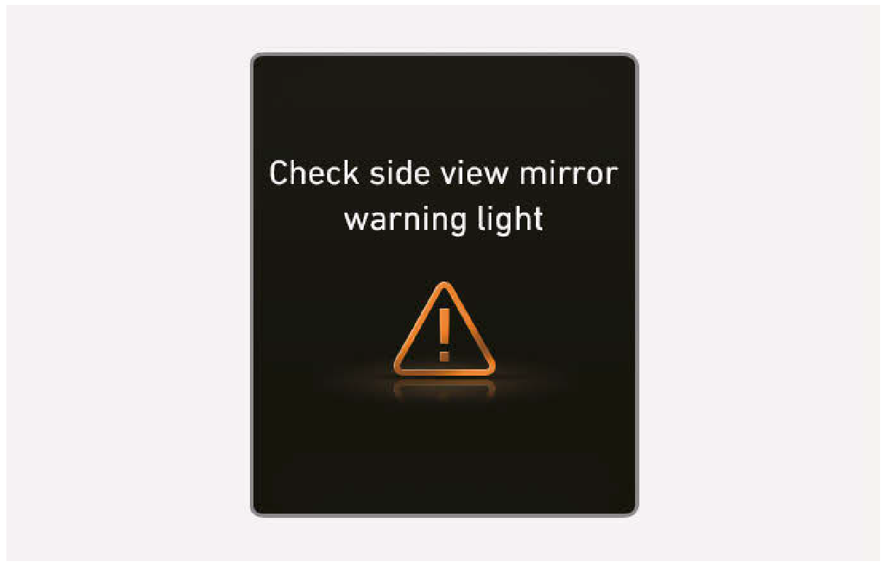 車外後視鏡警告燈操作不正常時,“Check side view mirror warning light” 警告訊息會在儀錶組顯示幾秒鐘,且主()警告燈會在儀錶組亮起。如果出現此狀況,我們建議您將車輛交由三陽汽車經銷商檢查。
