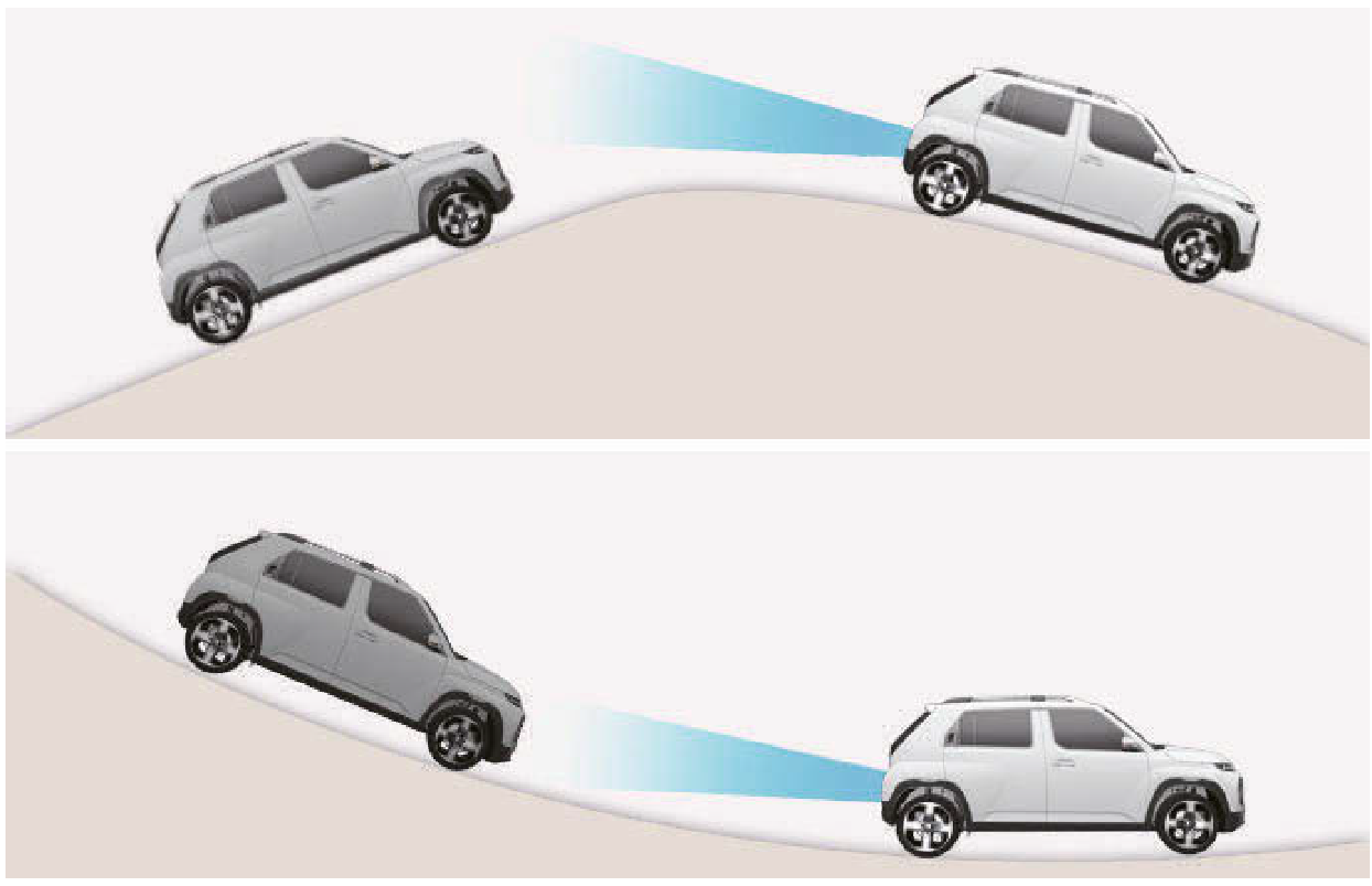在高度不同的車道駕駛時,盲點碰撞避免輔助可能無法正常操作。此功能可能無法偵測到高度不同的車道上的車輛(即地下道連接路段、使用段差分流的交叉路口等)。