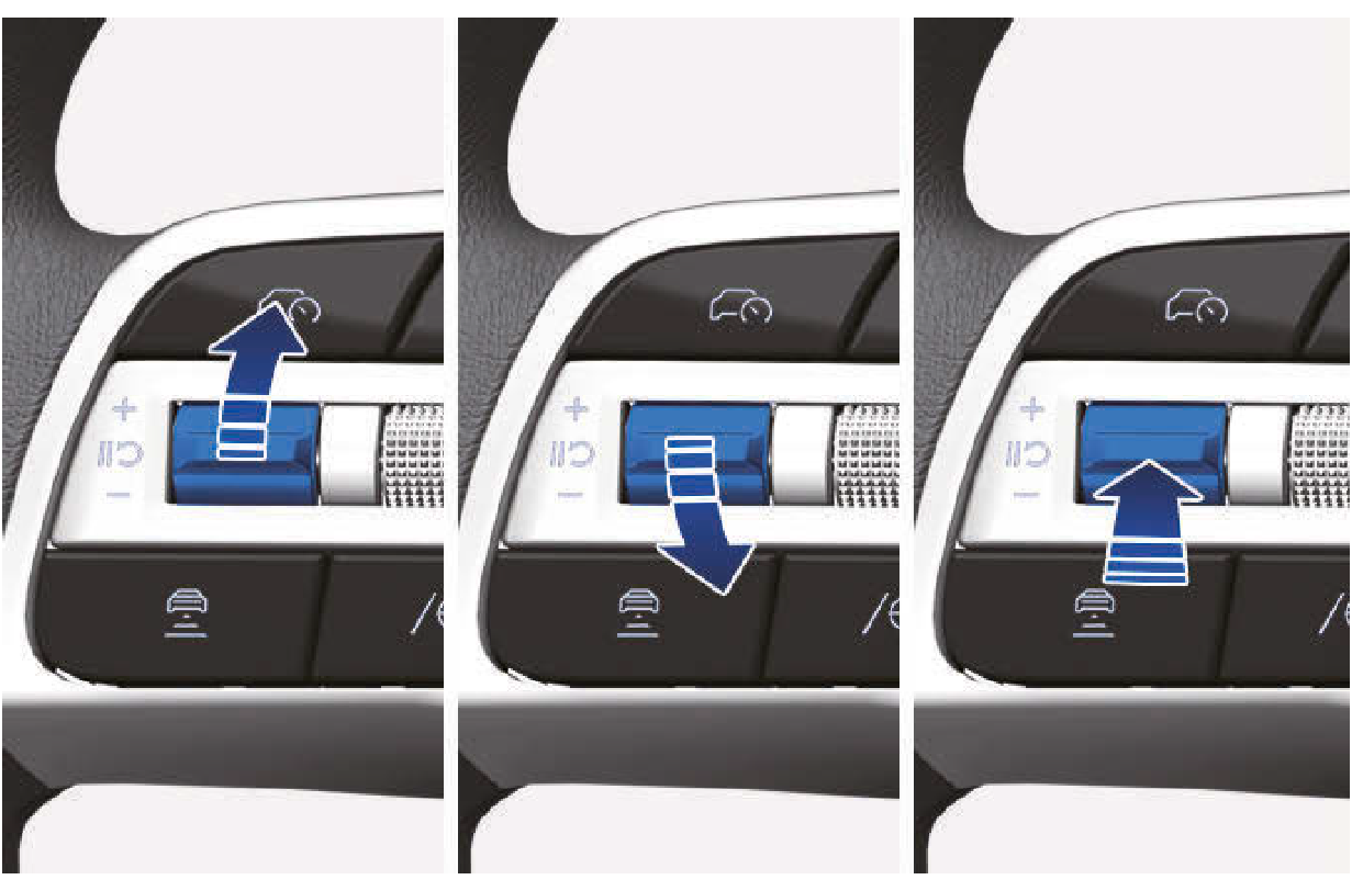 - 開關維持向上推或向下壓時,將會增加或減少設定的速度10 km/h。