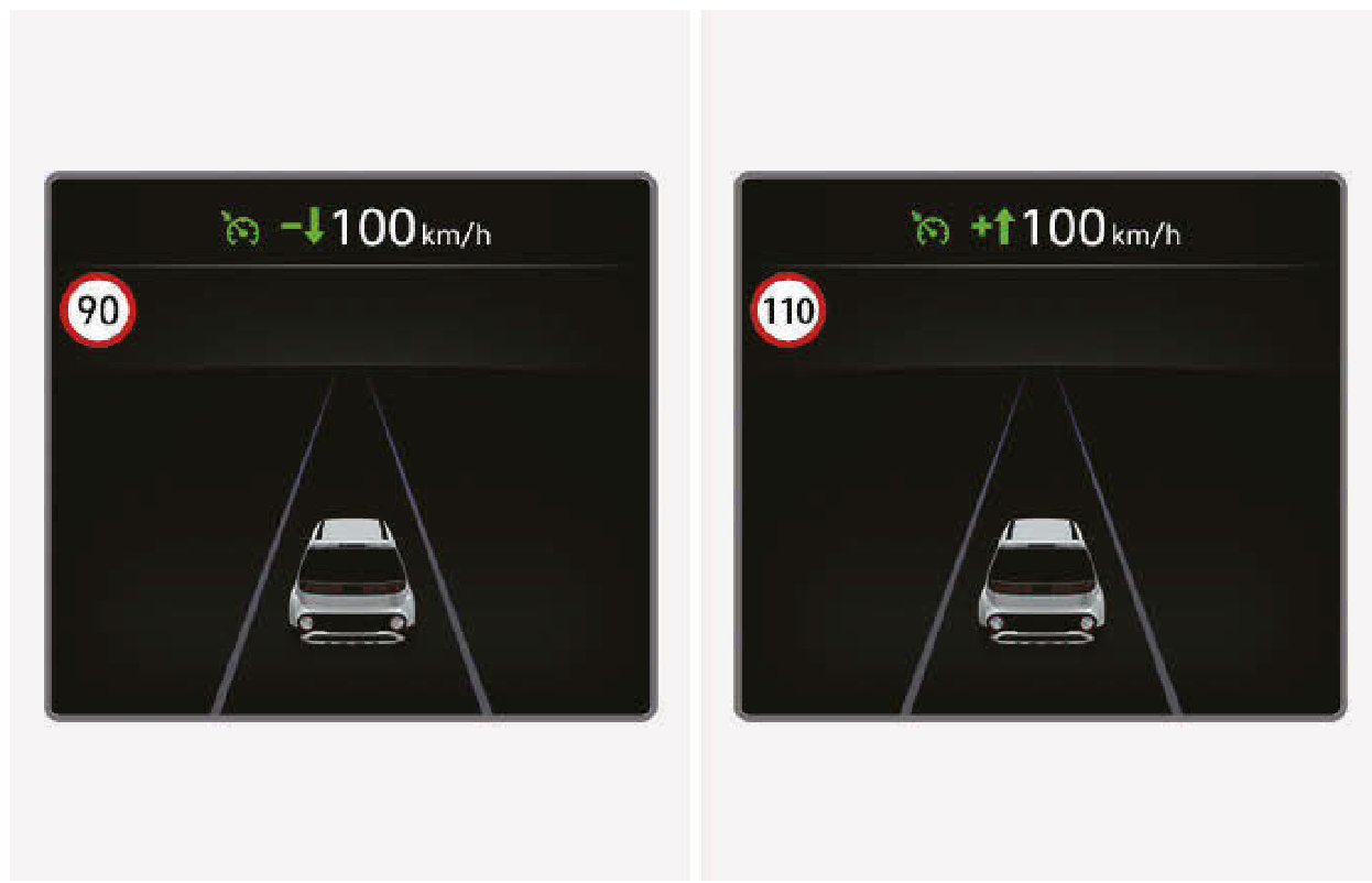 如果手動速限輔助或智慧定速控制操作期間道路的速限變動,將會顯示向上或向下的箭頭,以告知駕駛人設定的速度必須變更。此時,駕駛人可以利用方向盤上的+或﹣開關,依據速限改變設定的速度。