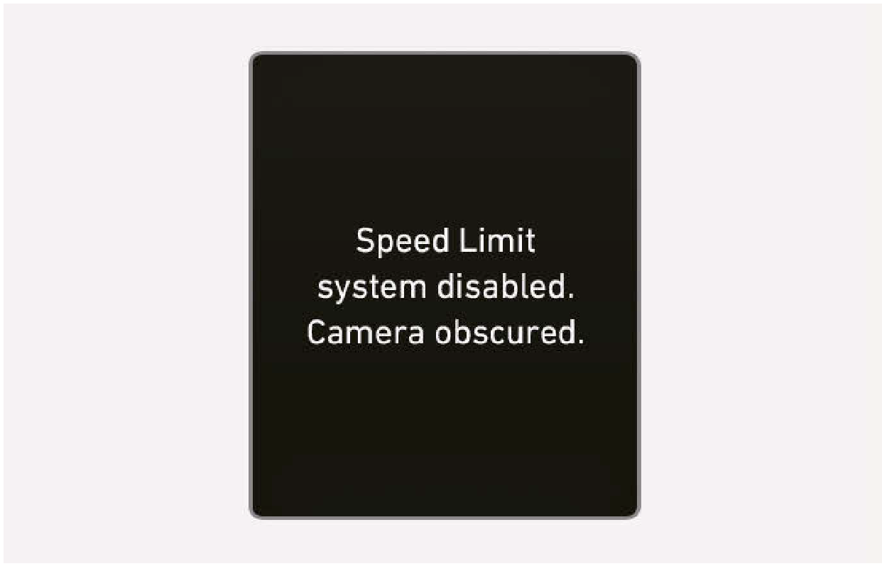 前視攝影機所在位置的擋風玻璃被積雪或雨水等異物覆蓋時,偵測性能將會降低,且智慧速限輔助會暫時受到限制或停用。如果發生此狀況,“Speed Limit system disabled. Camera obscured.” 警告訊息和速限()警告燈會在儀錶組顯示。