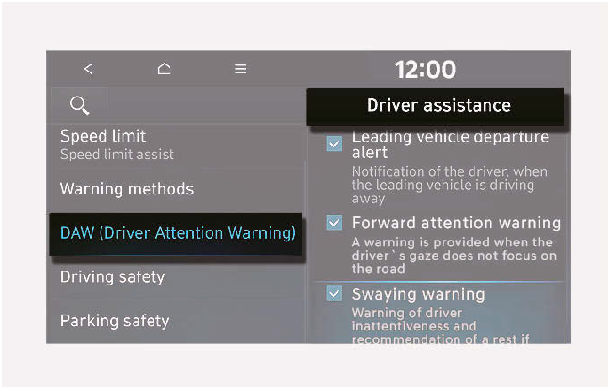車輛運轉時,在資訊娛樂系統選擇或取消Settings (設定) > Vehicle (車輛) > Driver assistance (駕駛人輔助) > DAW (Driver Attention Warning) (DAW (駕駛人注意力警告),然後啟用Leading vehicle departure alert (前方車輛離開提醒)以設定是否使用每一功能。