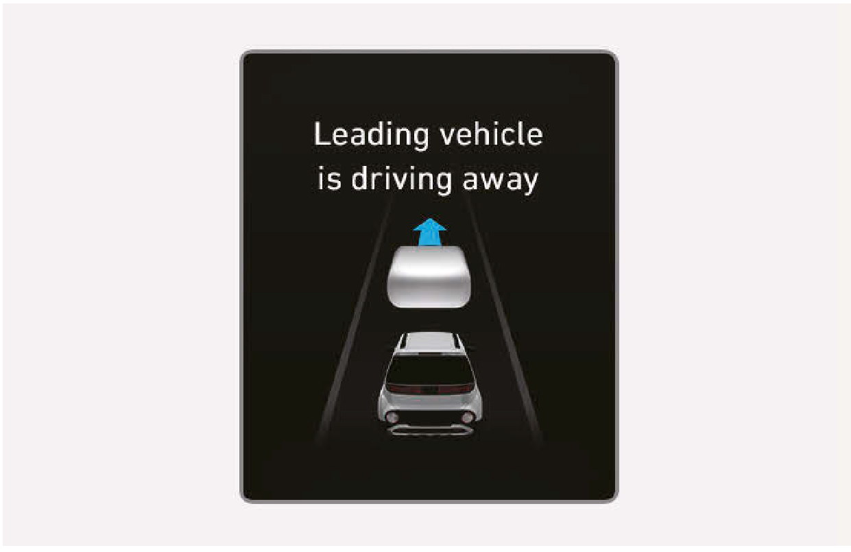前方車輛從停止狀態起步離開時,前方車輛離開提醒會藉由在儀錶組顯示 “Leading vehicle is driving away” 訊息,並響起警告聲,以通知駕駛人。